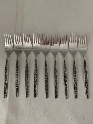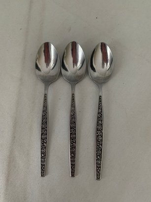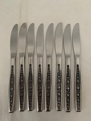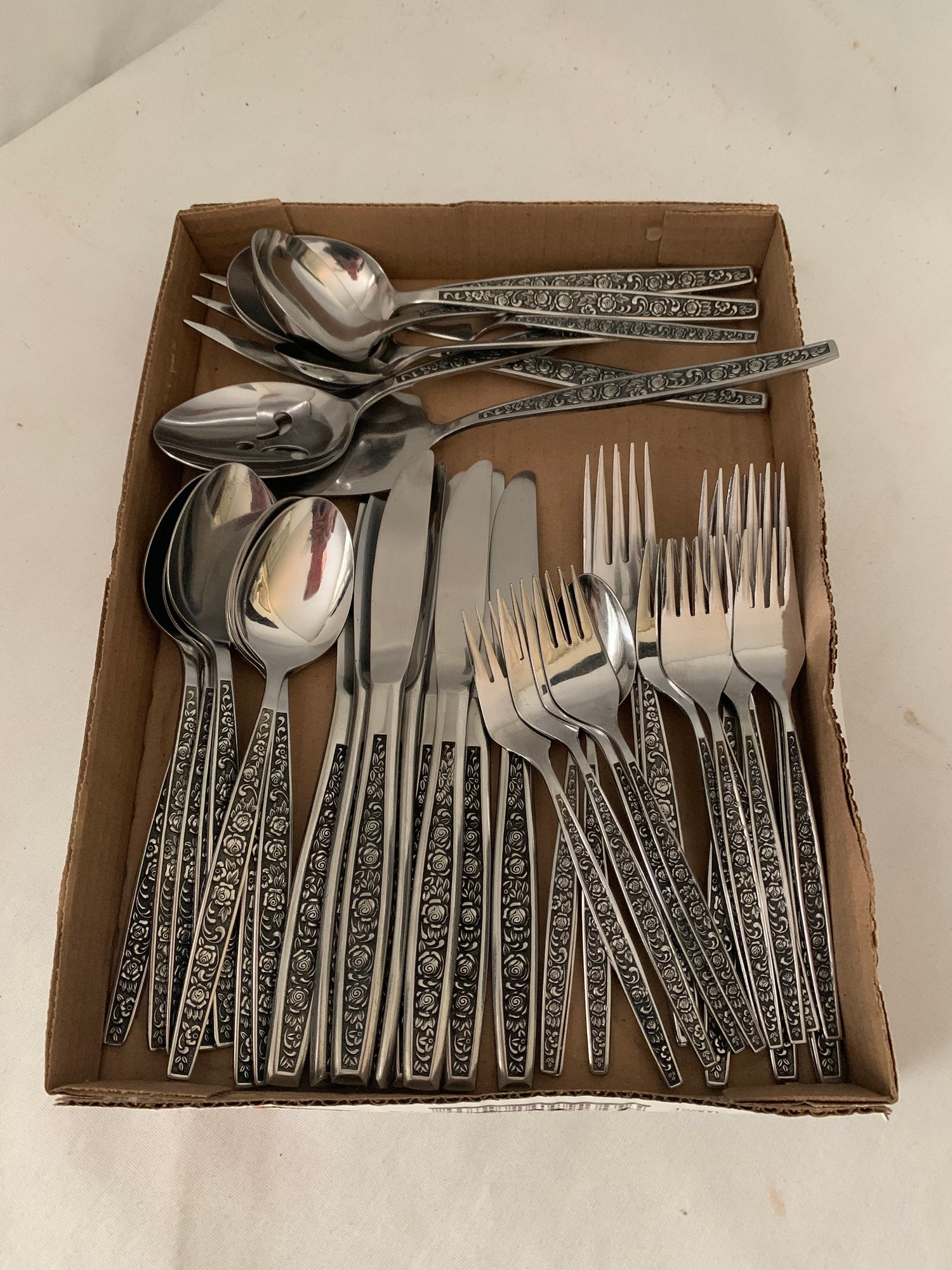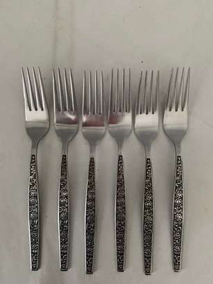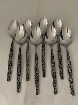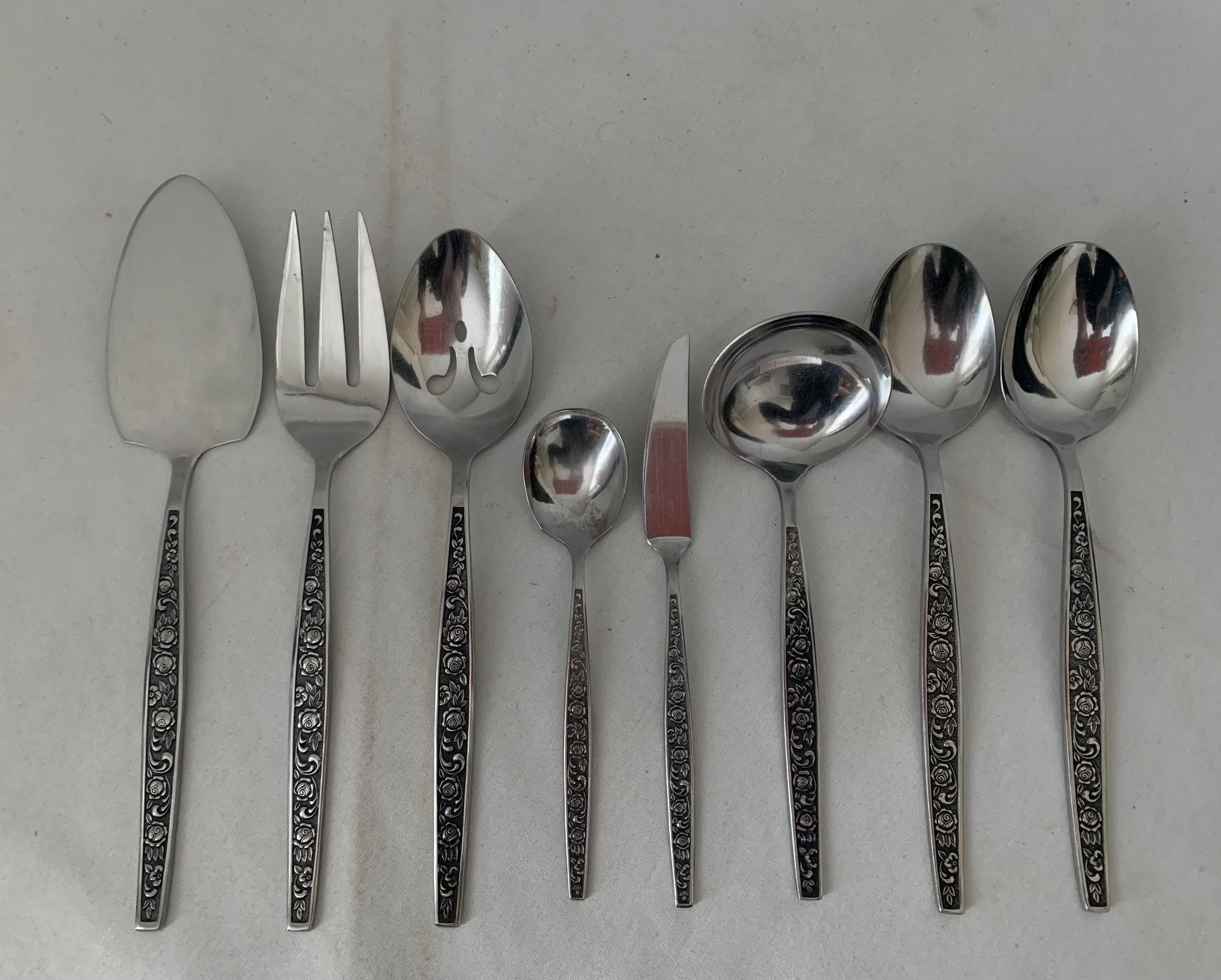 Granada Rose stainless steel flatware. Handle of each piece has rose pattern with black background. Total of ~41 pieces: 6 dinner forks, 9 salad forks, 7 soup, 3 teaspoons, 8 knives & 8 serving pieces.