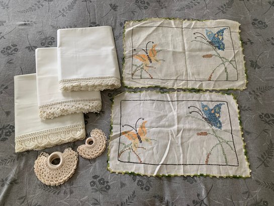 Linens - 3 sets of 100% cotton pillowcases with crocheted edge (different designs), 2 embroidered place mats and 12 crochet rings (2 sizes) (napkin rings?)