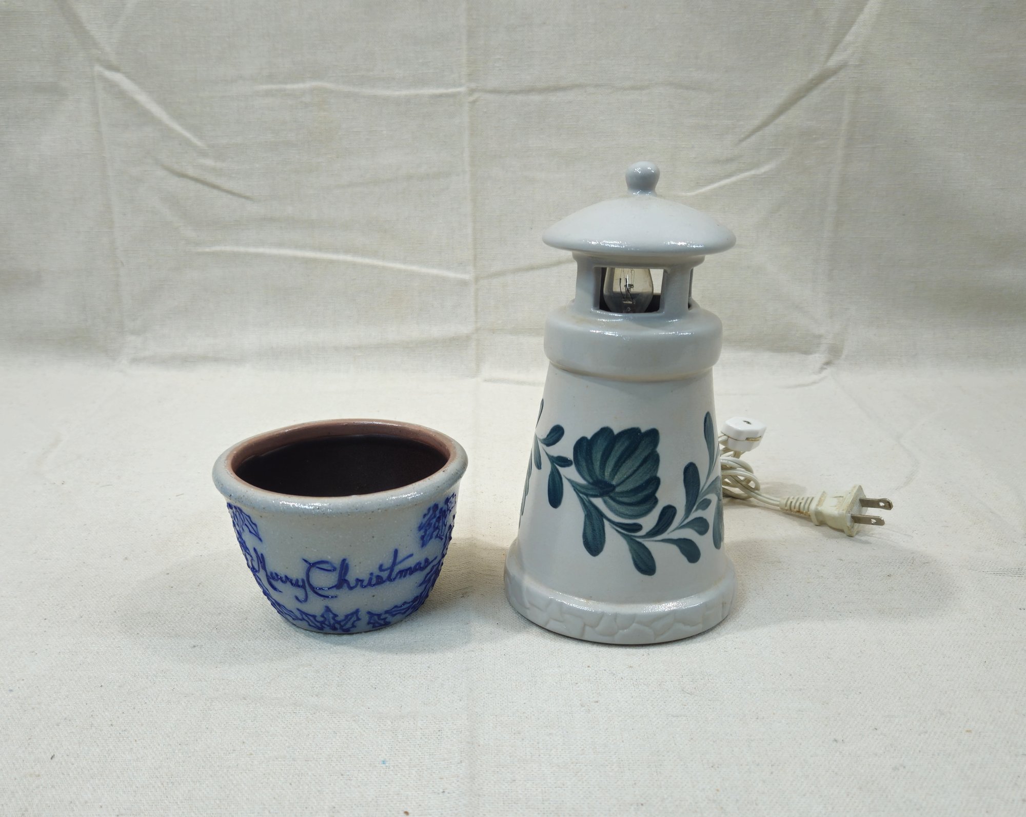 Stoneware Merry Christmas bowl & lighthouse lamp. Both pieces produced and marked with impressed stamp by Salmon Falls Stoneware.
