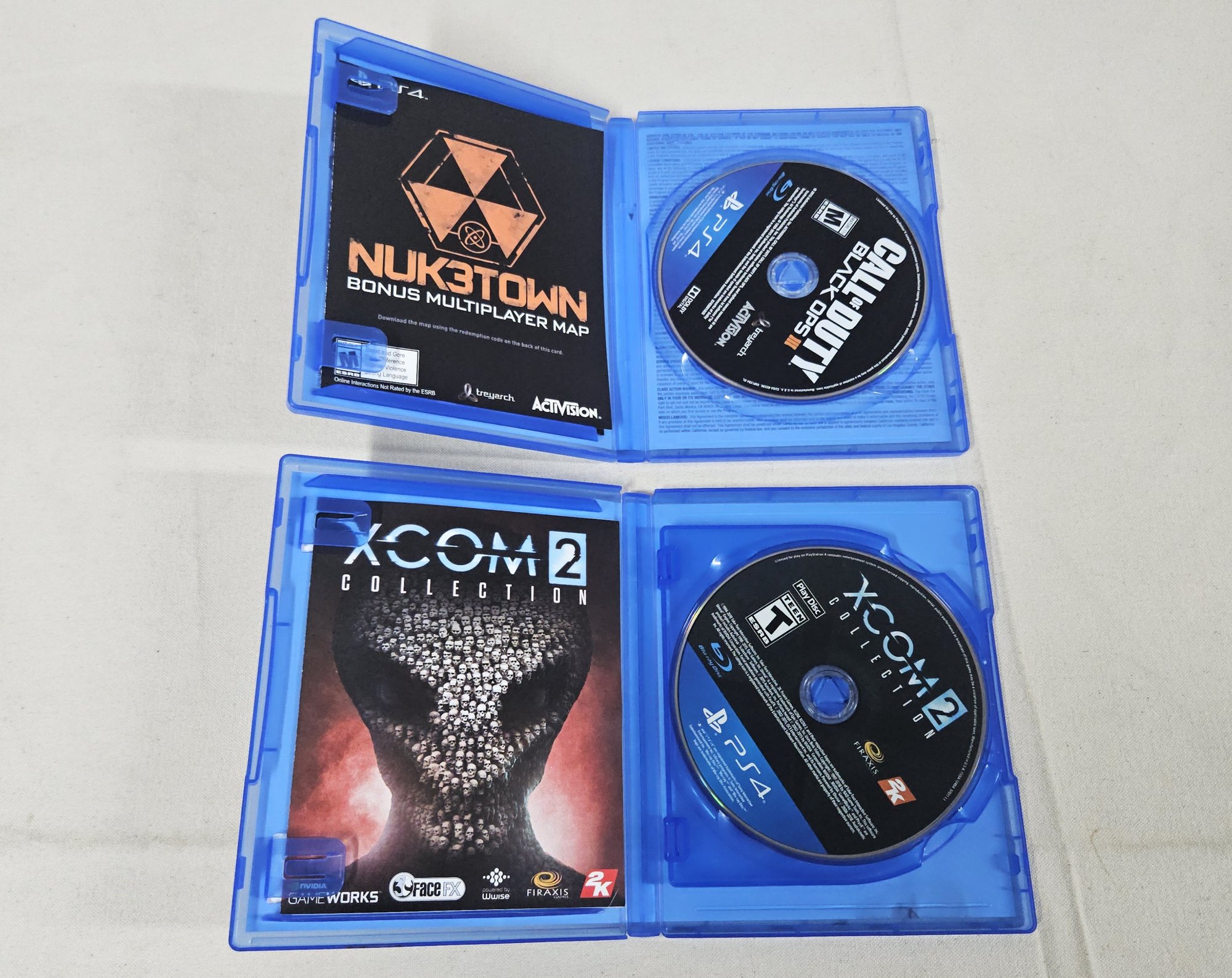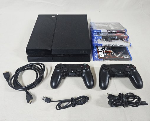 Sony Playstation PS4 game console with 2 controllers, cords, and ~3 assorted games including Mafia III, Call of Duty Black Ops III, and XCOM 2 Collection.