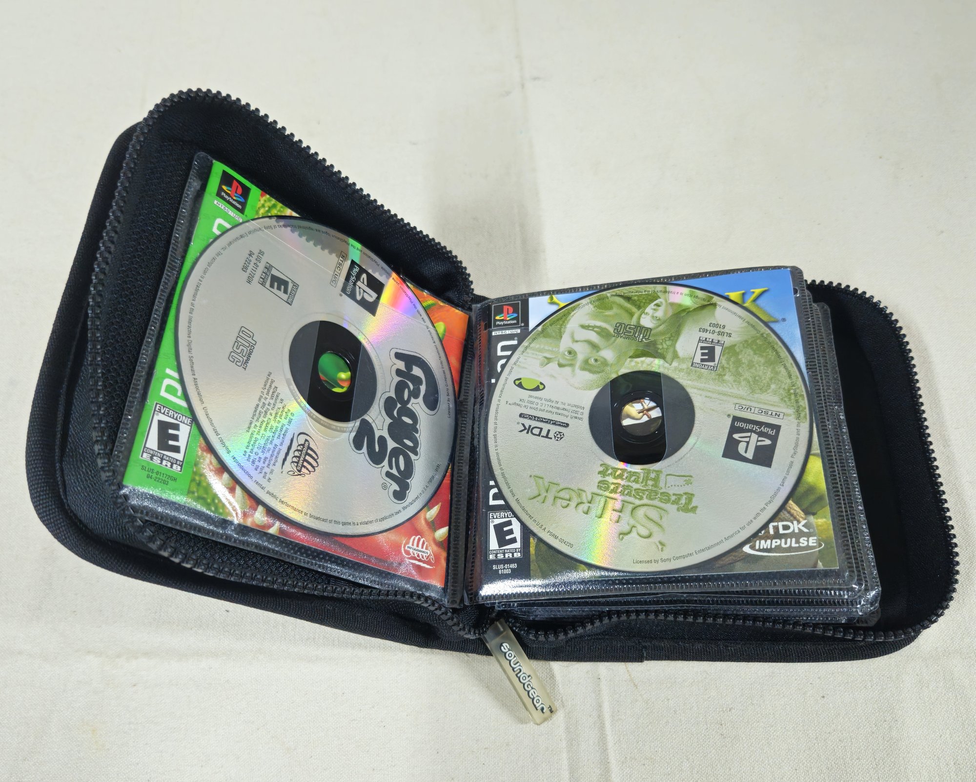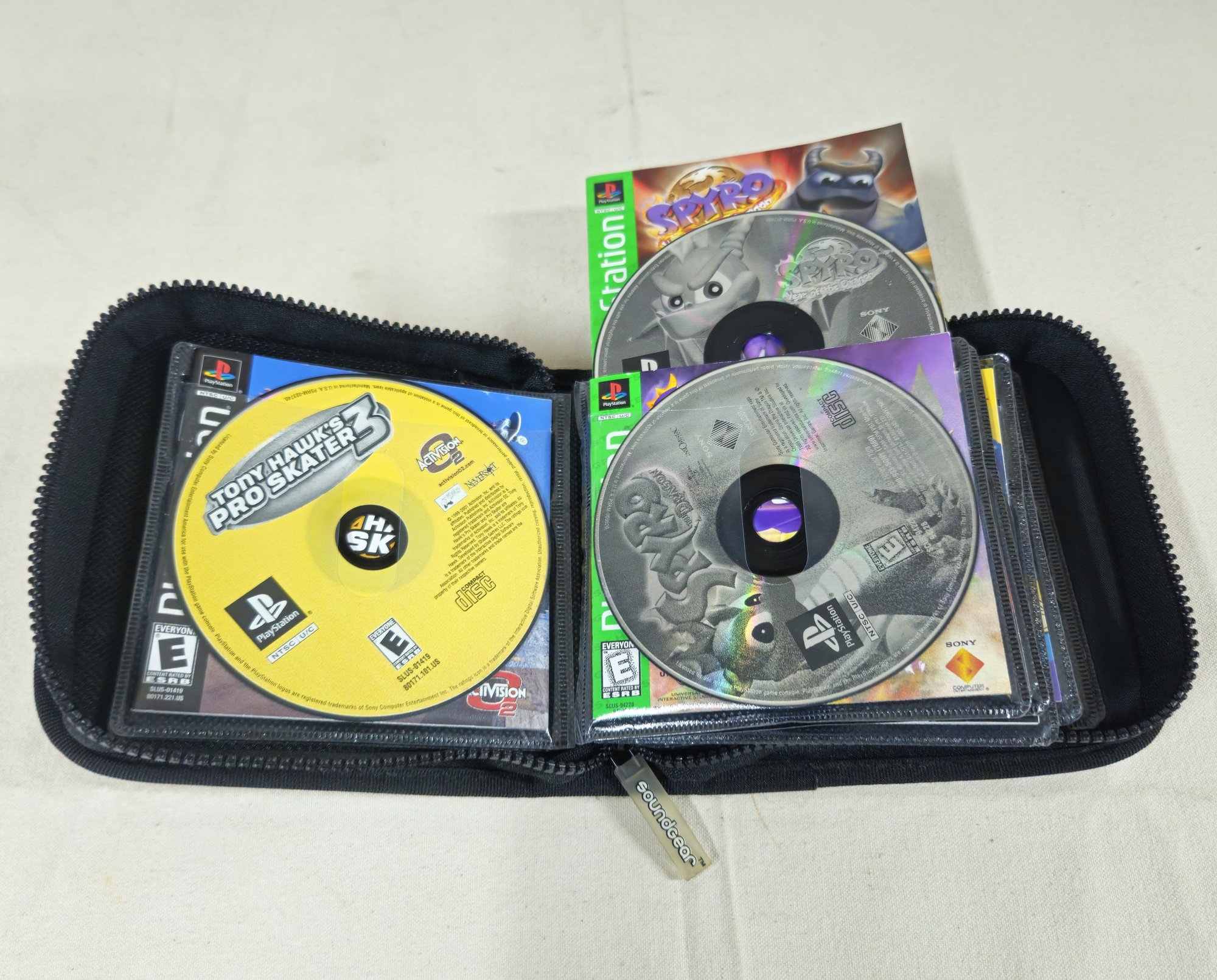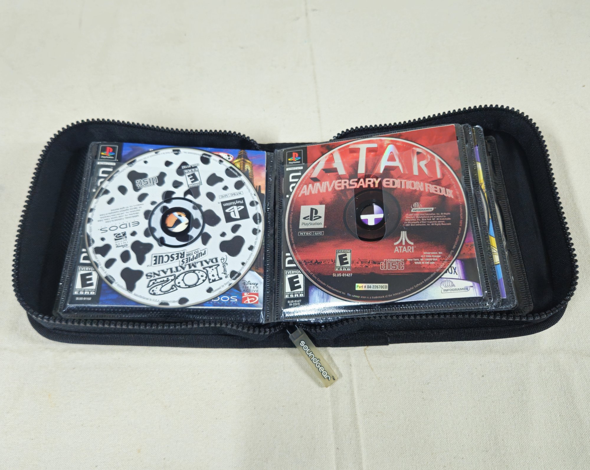 Sony Playstation PS one console set with 18 games including Test Drive 5, Frogger 2, Shrek Treasure Hunt, Tony Hawk's PS3, Spyro The Dragon, Spyro Year of the Dragon, 102 Dalmatians Puppies to the Rescue, Atari Anniversary Edition Redux, Turbo Prop Racing, Buzz Lightyear of Star Command, Who Wants to be a Millionaire 3rd Edition, Spin Jam, Austin Powers Pinball, Namco Museum Vol. 1, Ford Racing, GT2, Chicken Run, Beyblade, & 2 extra Mad Catz Dual Force controllers.