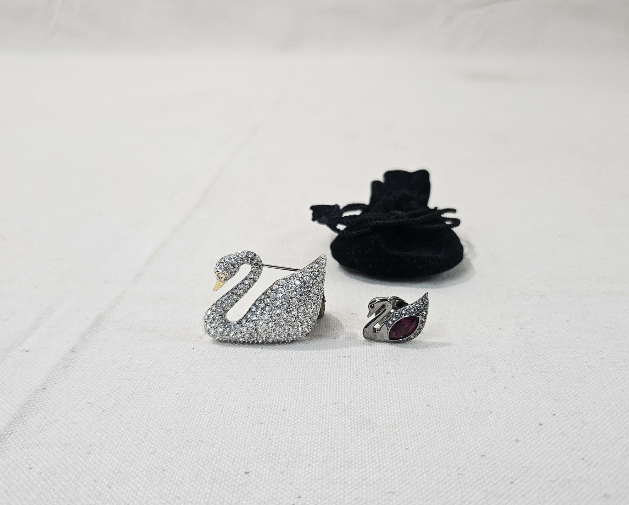 Swarovski brooch & pin including a Centenary Swan brooch and a red crystal tie tack/lapel pin. Both signed on back with impressed Swarovski swan logo.