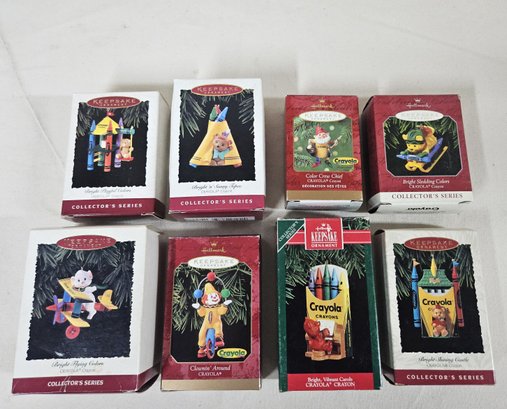 Group of ~8 various boxed Keepsake Crayola Crayon Ornaments including Collector's Series 3, 5-8, & 10, Clowin' Around, and Color Crew Chief. Produced by Hallmark Cards, Inc.
