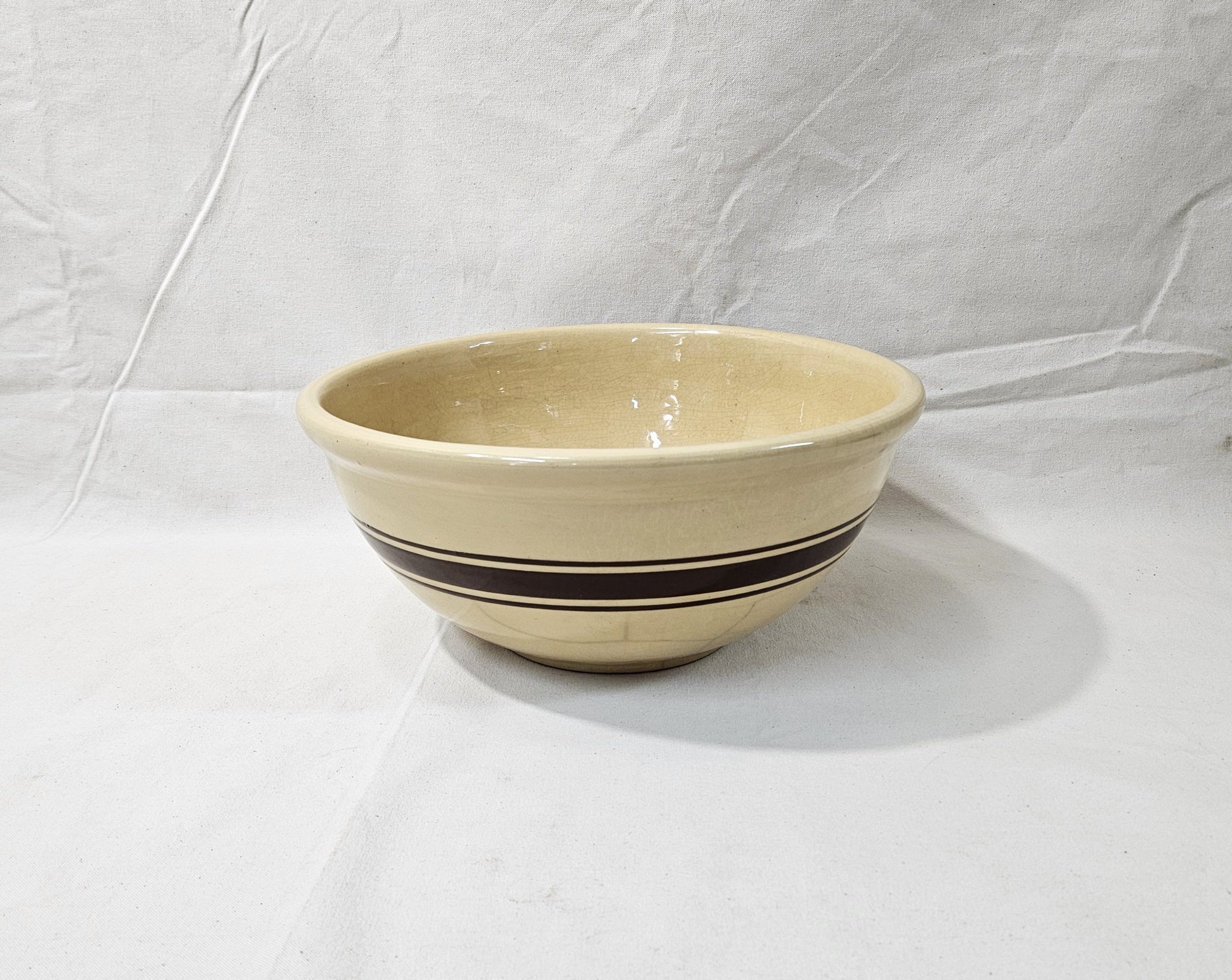 Notes: Vintage 14" XL Yellow Ware Brown band Stripe Mixing Dough Bowl is pre-owned showing signs of wear commensurate with age & use. Please review photos.