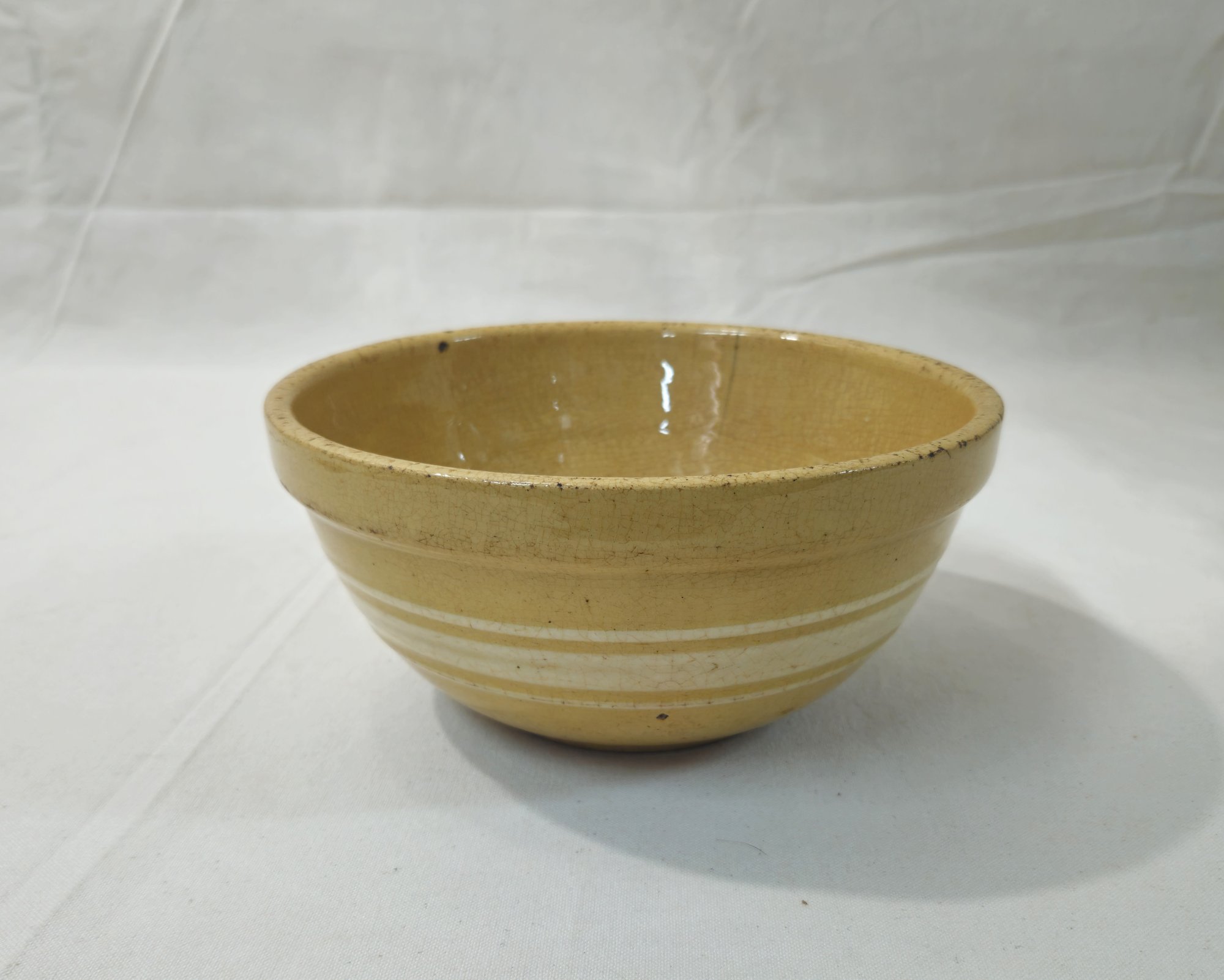 Notes: Vintage 8 1/2" Banded/Striped yellow Ware Mixing Bowl is pre-owned showing signs of wear commensurate with age & use. Please review photos.