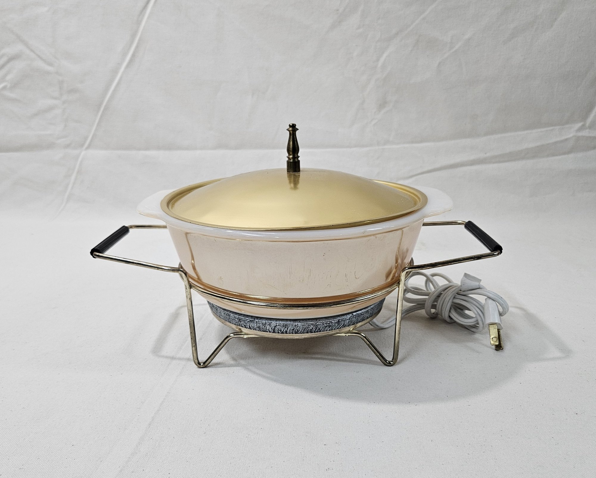 Vintage Fire King Peach Luster 448 2qt. round casserole with metal lid and electric warmer. Produced by Anchor Hocking Glass Co.
