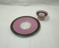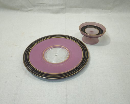Vintage art deco Czech art glass plate & dessert cup serving set decorated in pink, black, and gold.