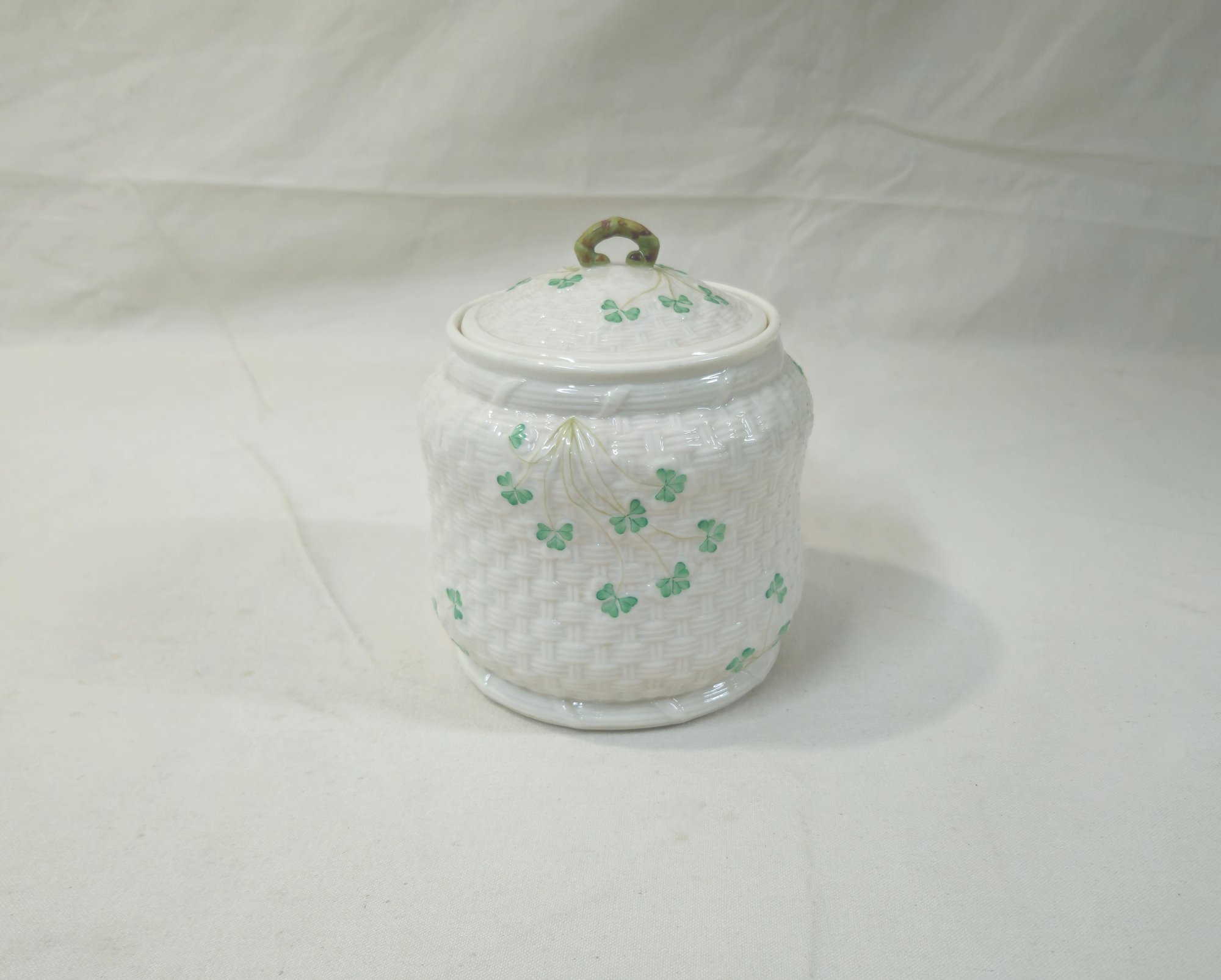 Vintage Shamrock biscuit barrel/cookie jar with Lid. Marked on base with Belleek green stamp logo.