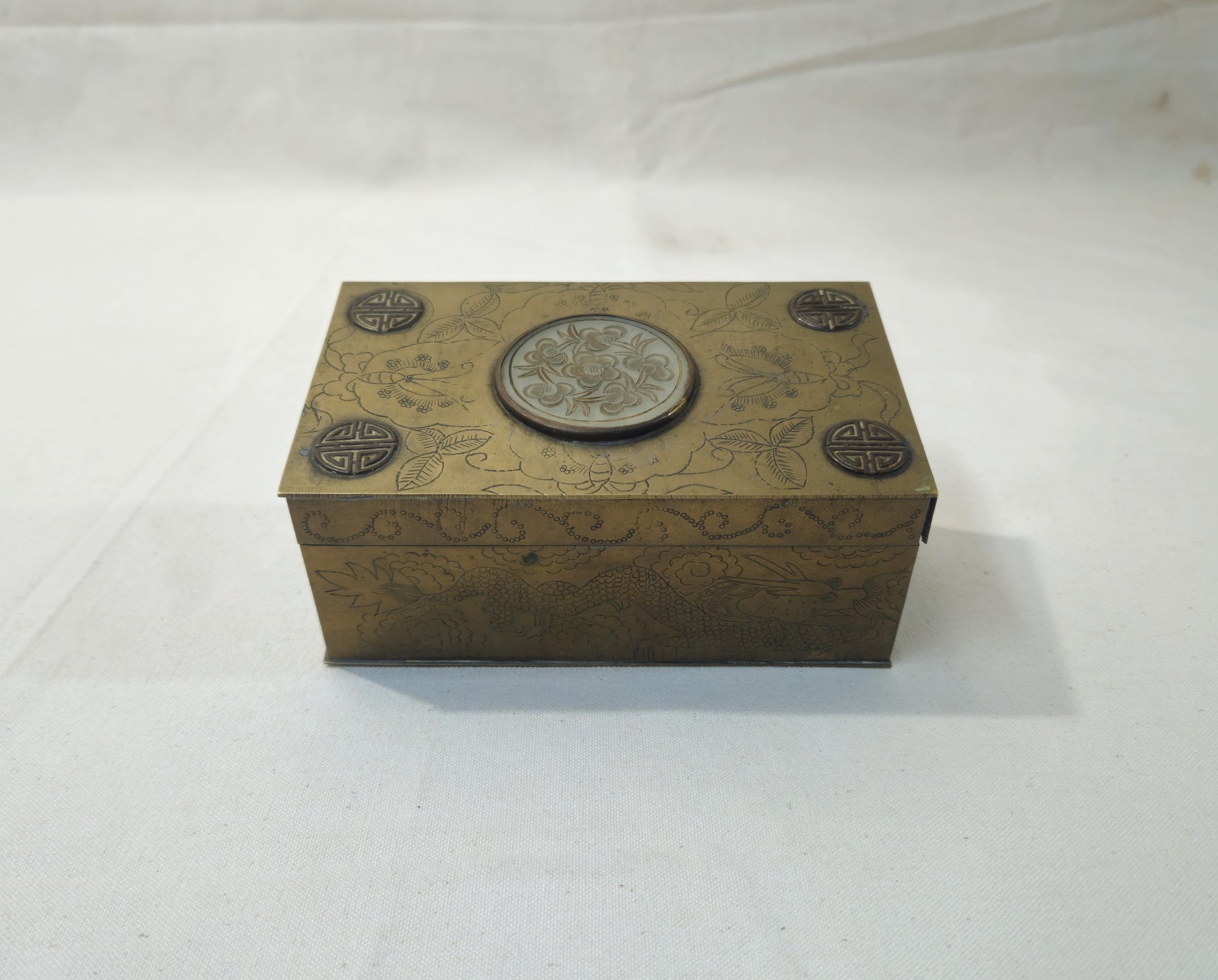 Vintage Chinese export brass cedar lined tobacco box decorated with engraved/etched dragon, fish, fruit, butterflies, foliate scroll, and a 2" floral etched stone disc. Stamped on base Made in China.