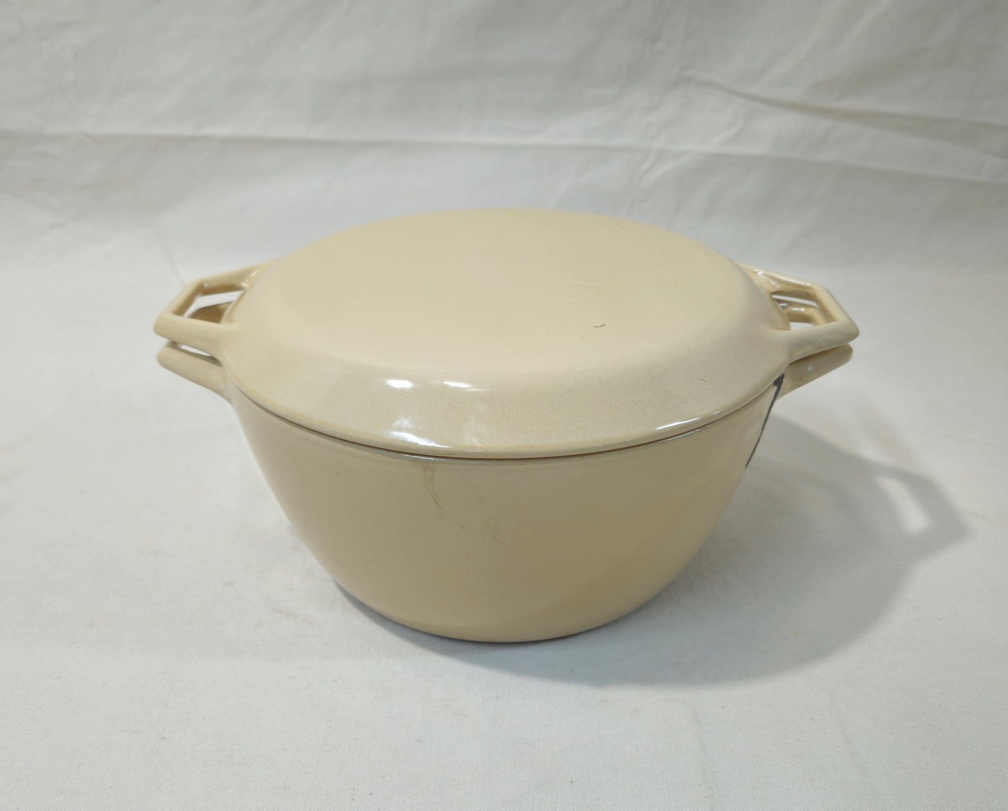Vintage D3 beige enamel cast iron Dutch oven. Marked on base and produced by Copco Denmark.