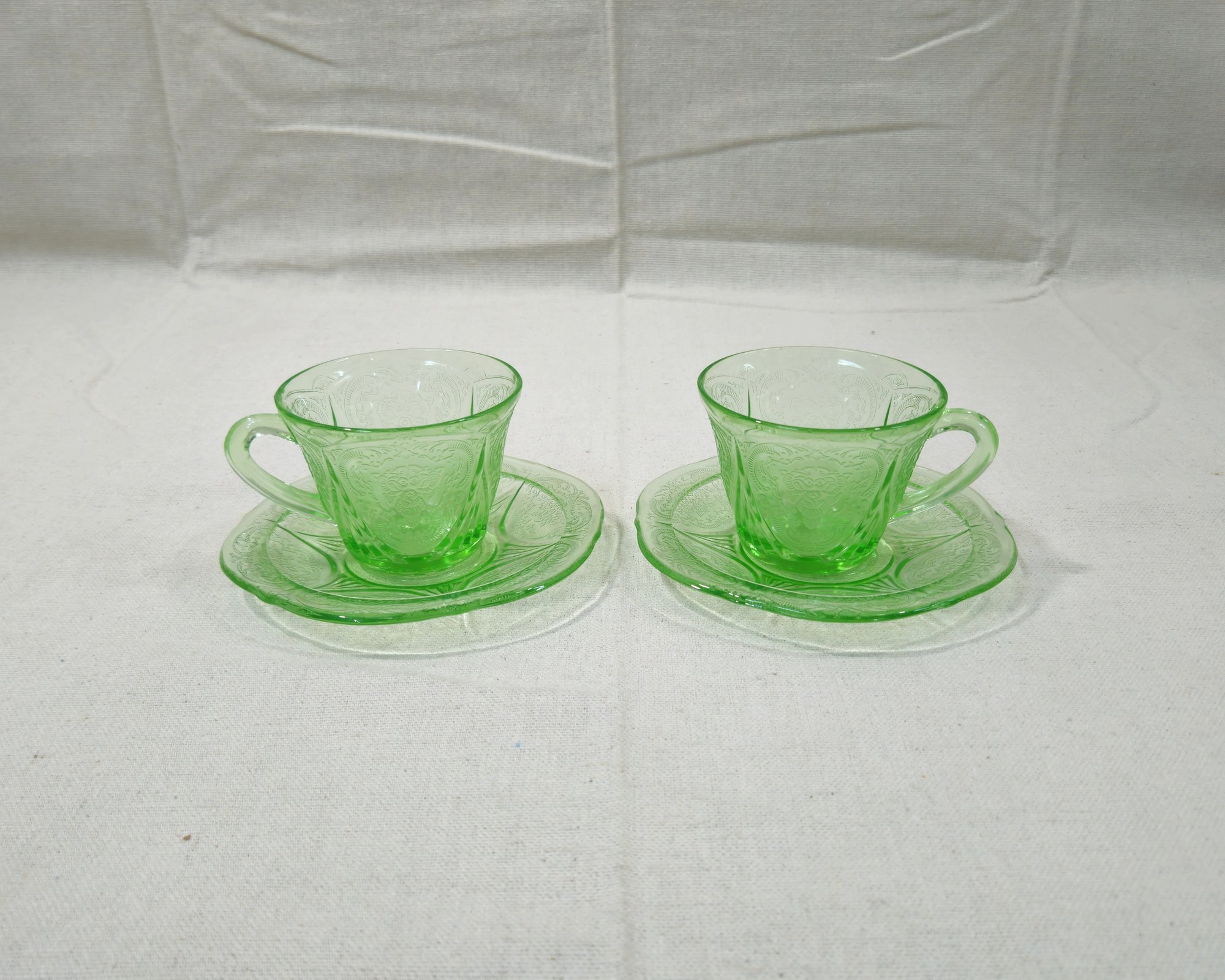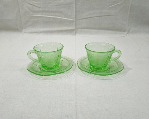 Vintage Depression era Royal Lace 2 cups & 2 saucers. UV reactive. Produced by Hazel-Atlas.