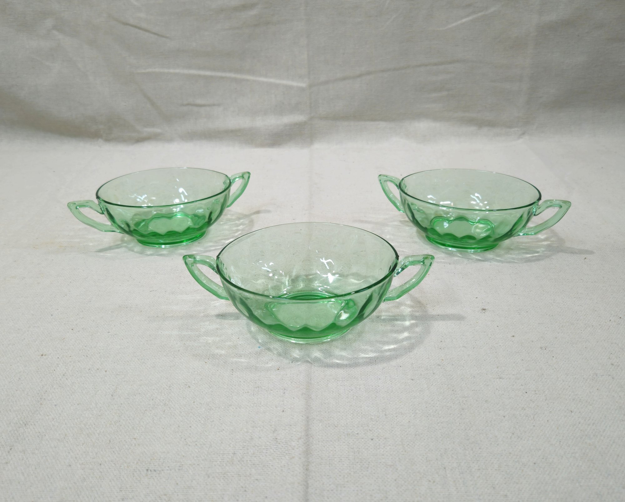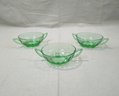 Group of ~3 vintage Depression Heisy Yeoman green glass cream soup bowls.