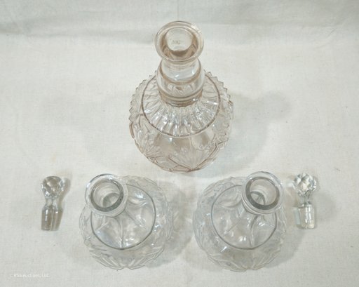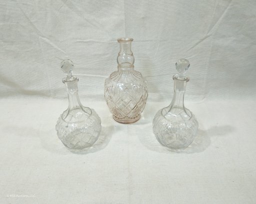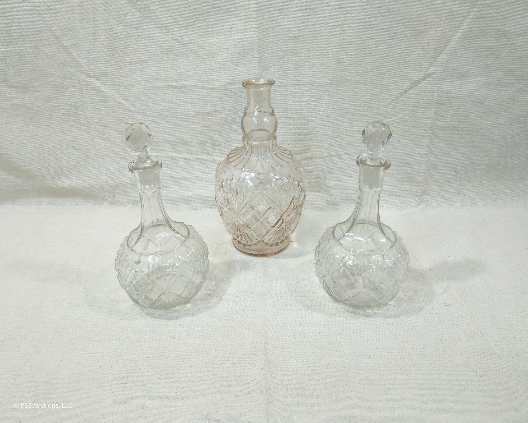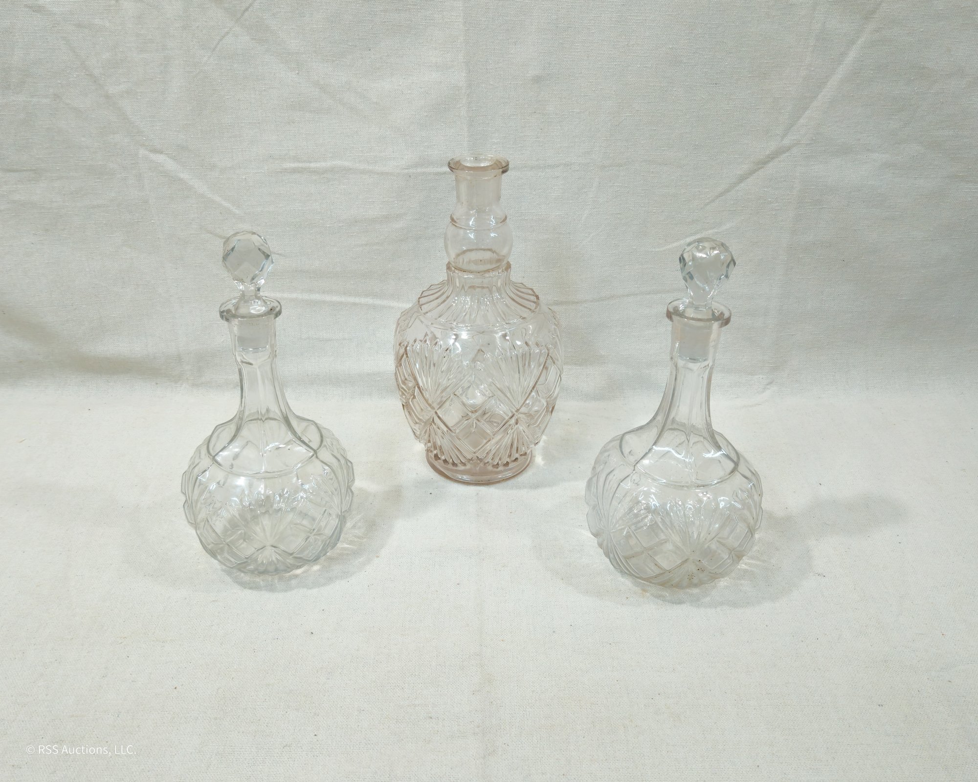 Group set of ~3 Diamond & Fan pattern glass liquor decanters including one larger bottle and 2 smaller bottles. Maker unknown.