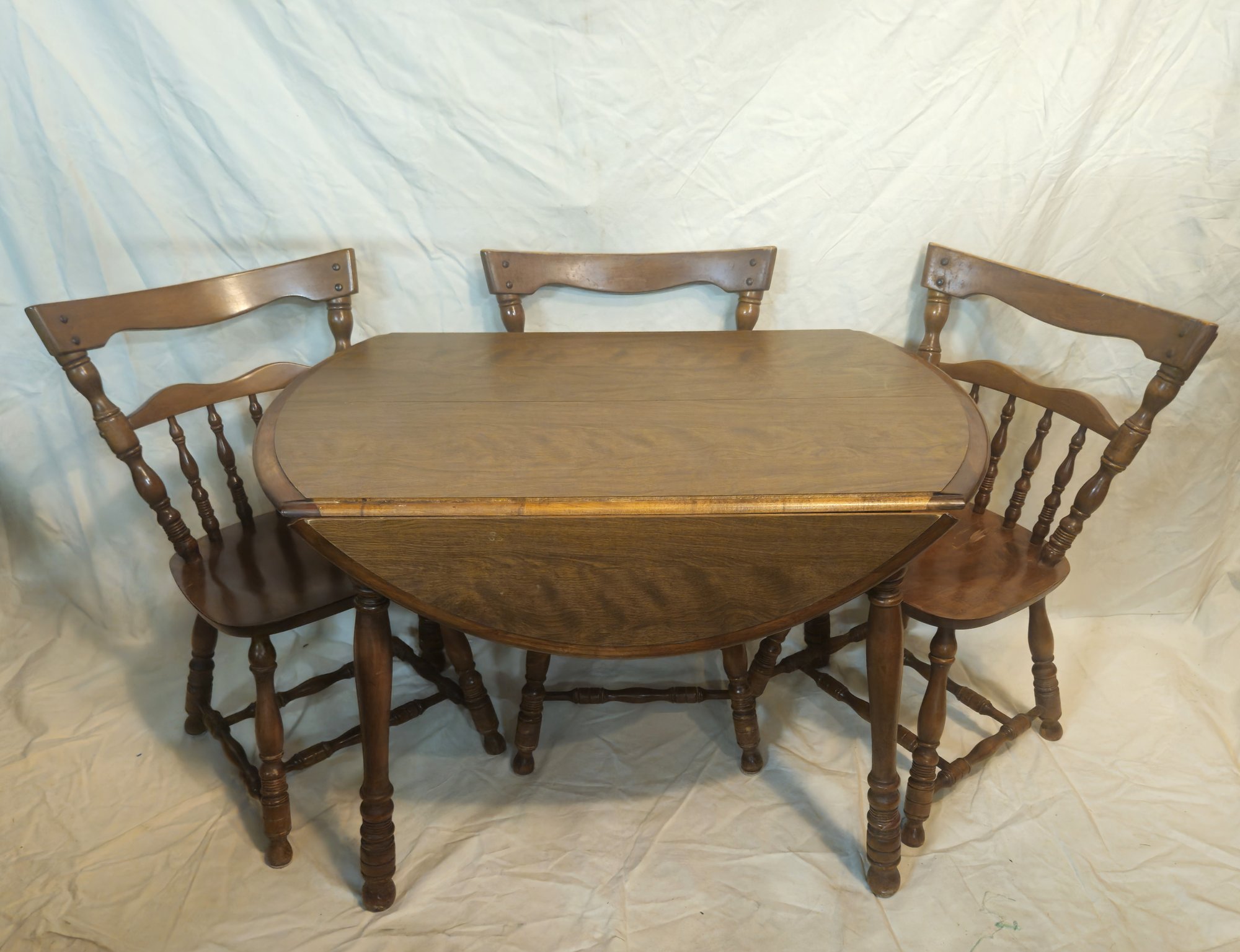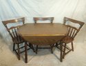 Vintage round drop leaf maple wood table & chairs. Table & chairs marked E.R. Buck.