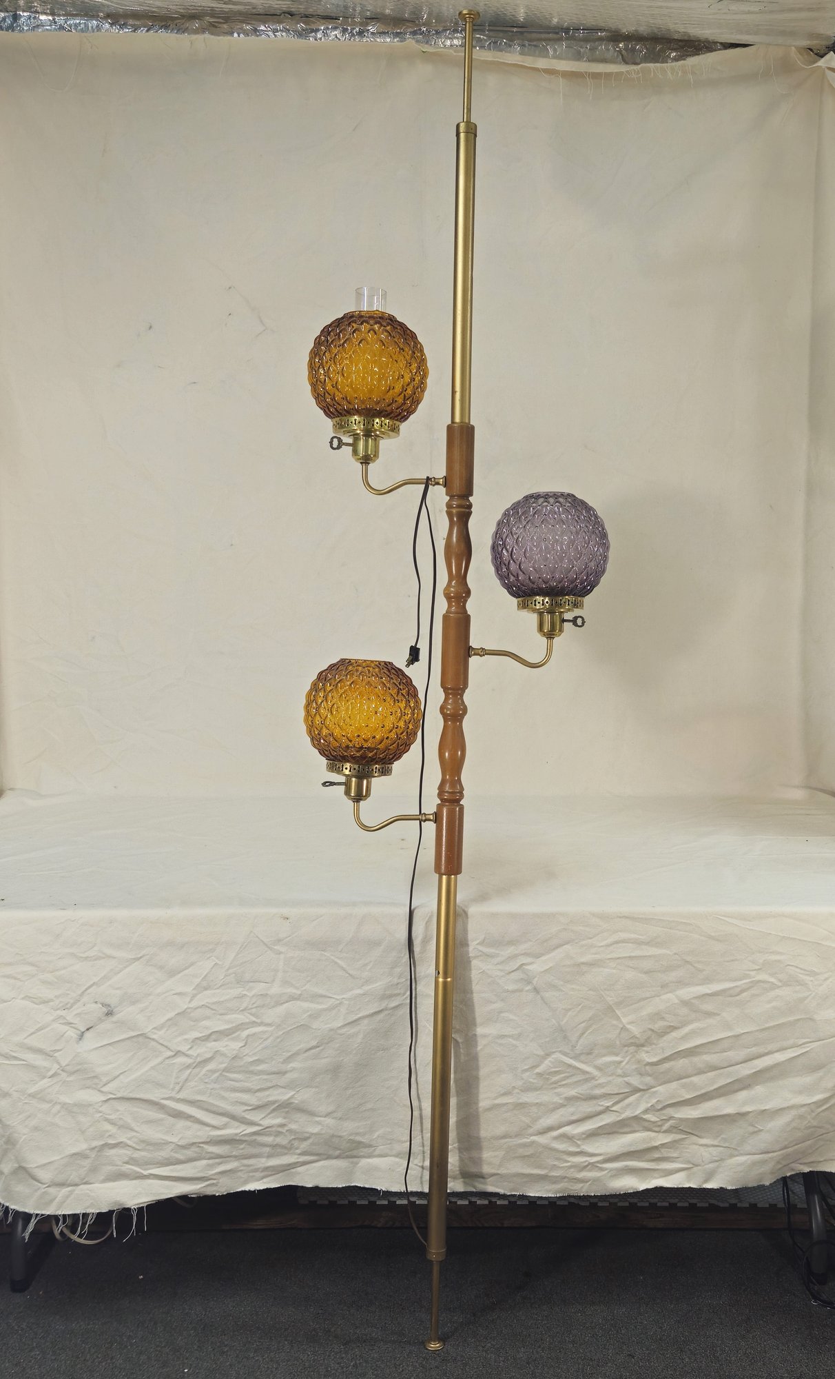 Vintage electric 3 arm tension pole lamp including a purple & 2 amber quilted glass round globes with glass chimneys.