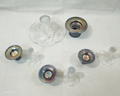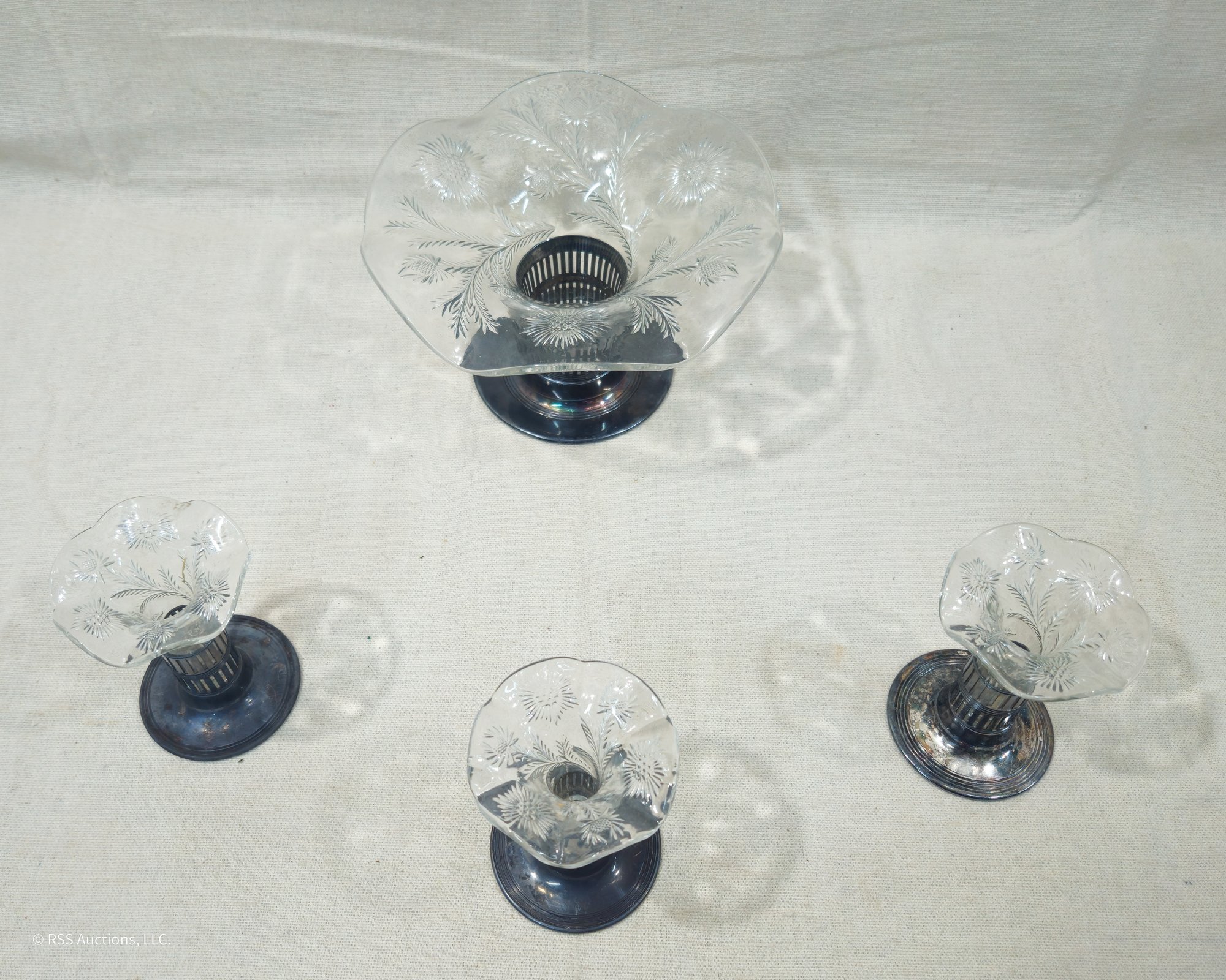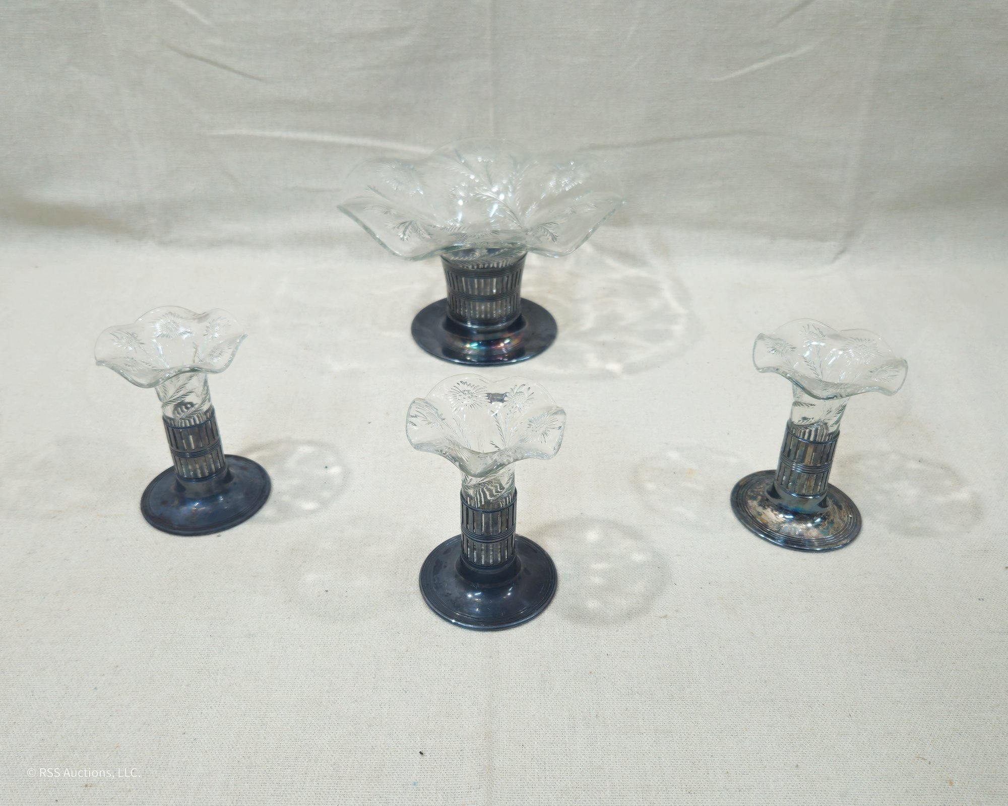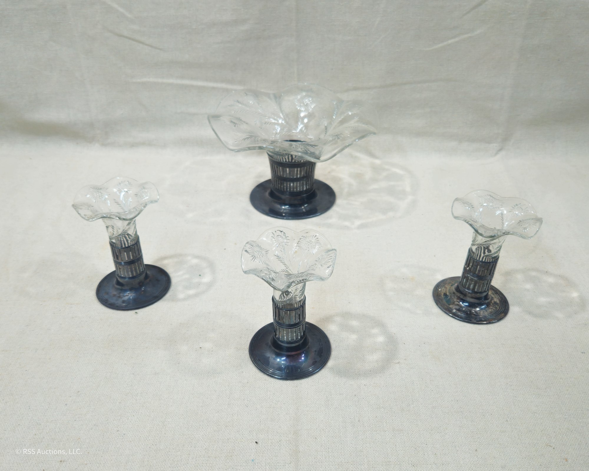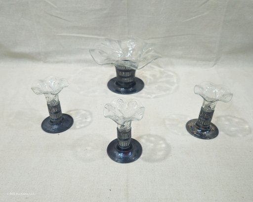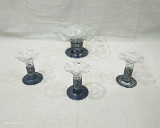 Set of ~4 vintage Forbes Silver Co. Silverplate & Glass Bud Vases including one larger centerpiece vase and three matching smaller vases.