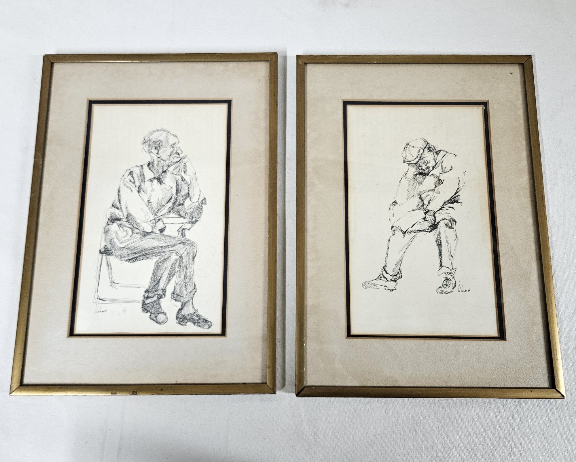 Vintage framed seated male portrait drawings. Signed h.scherer.