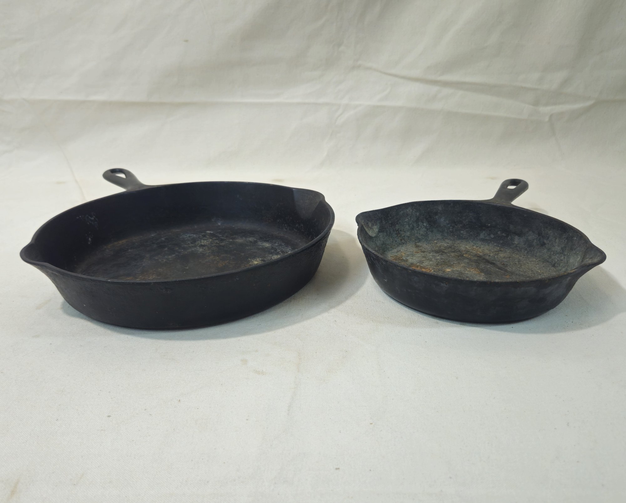 Group of vintage cast iron skillet pans including a #5 & a #8. Marked on base with small logo and produced by Griswold.