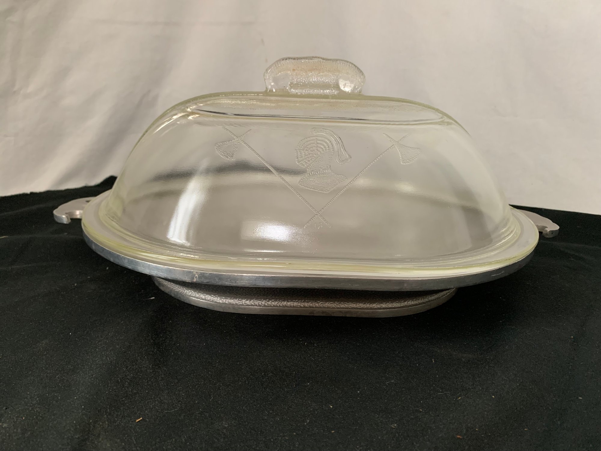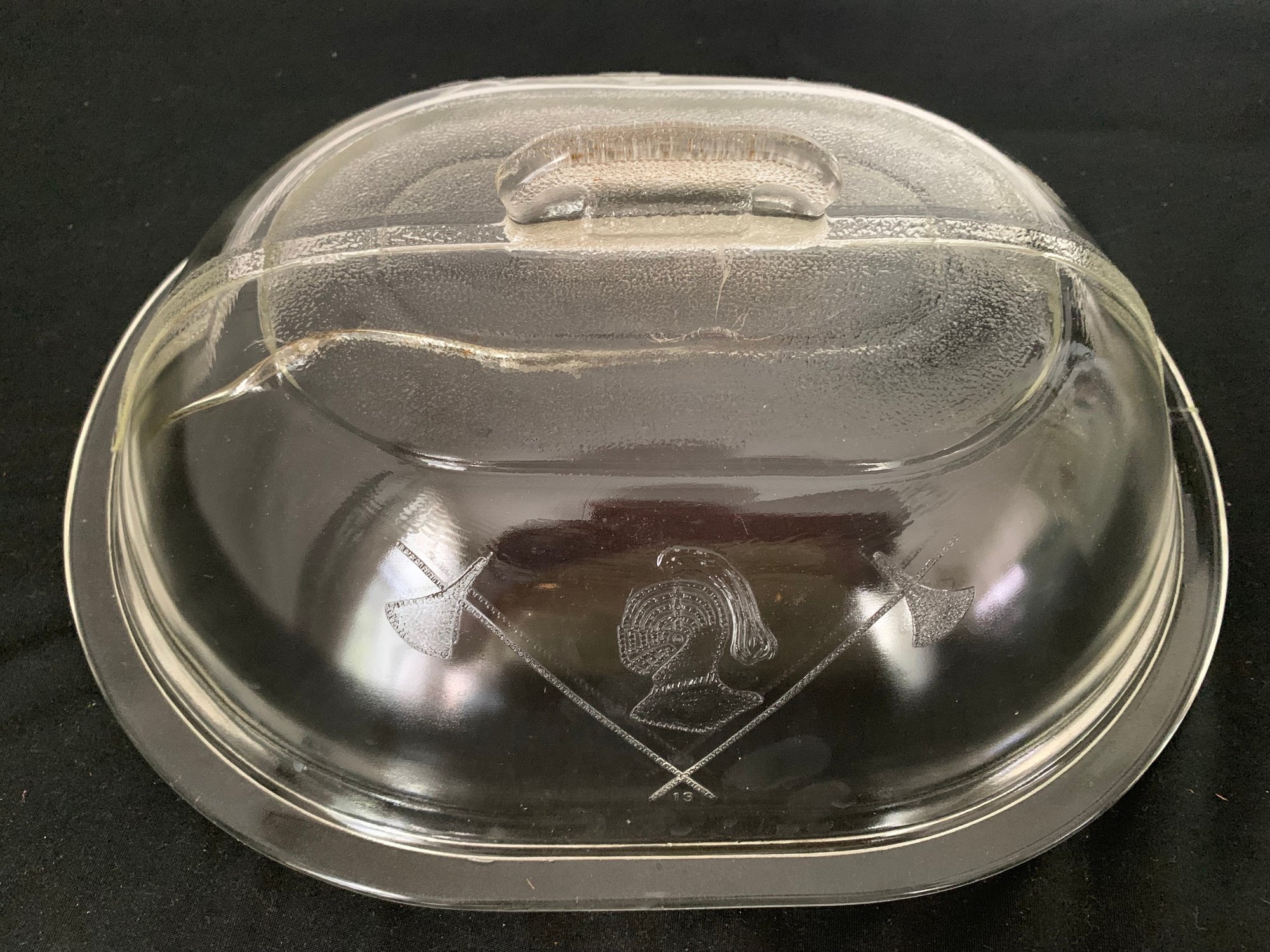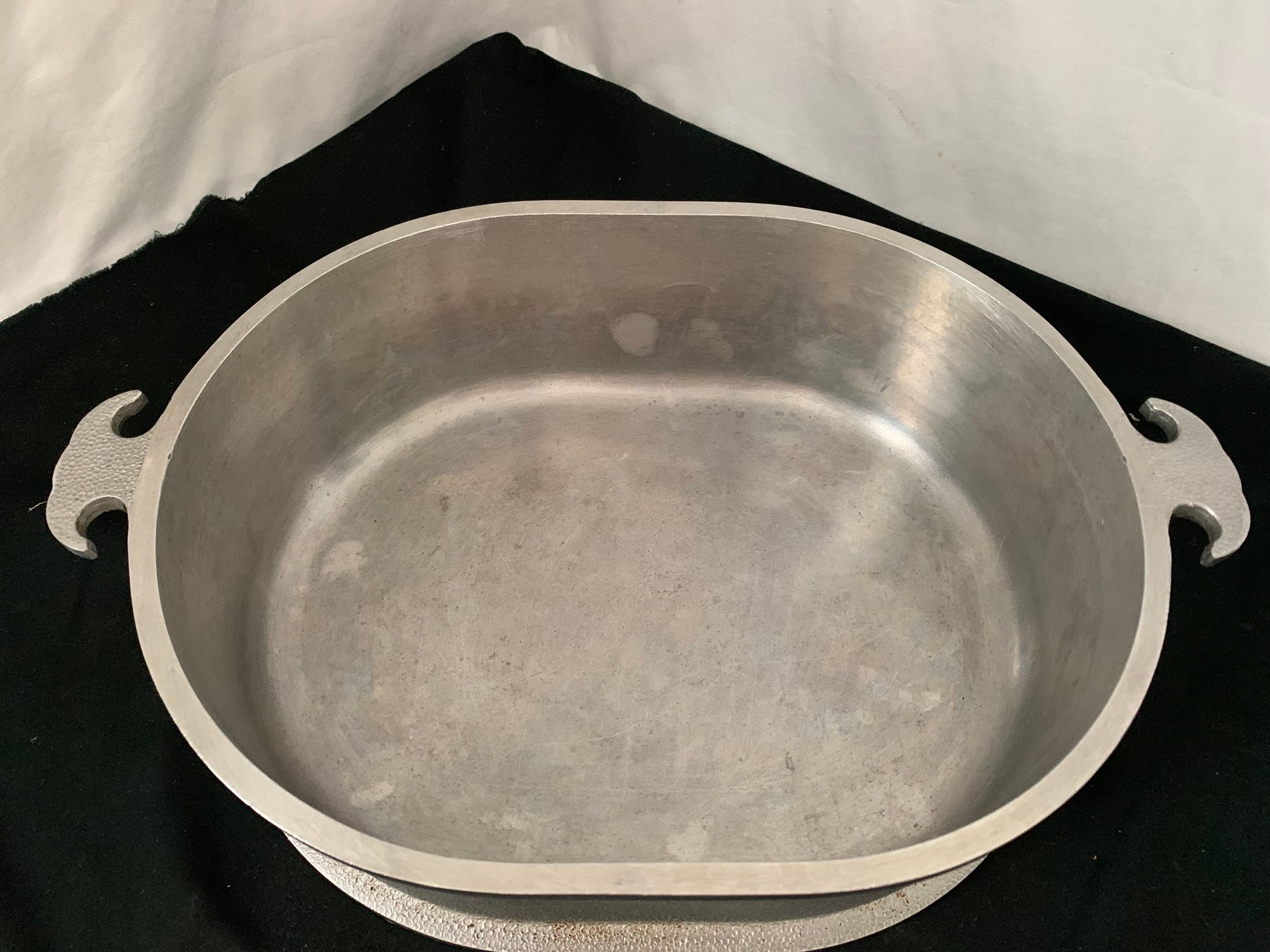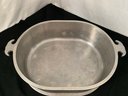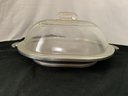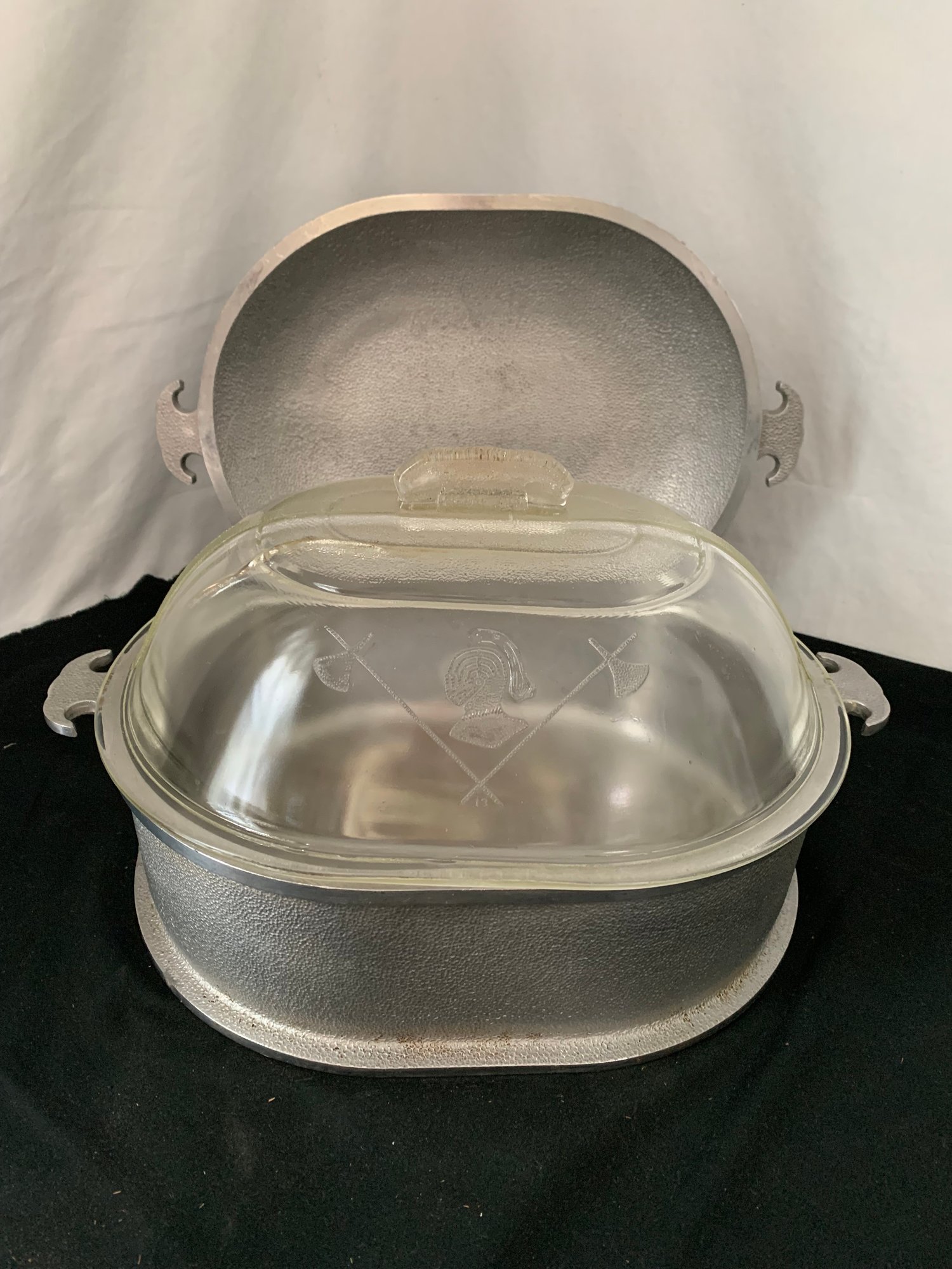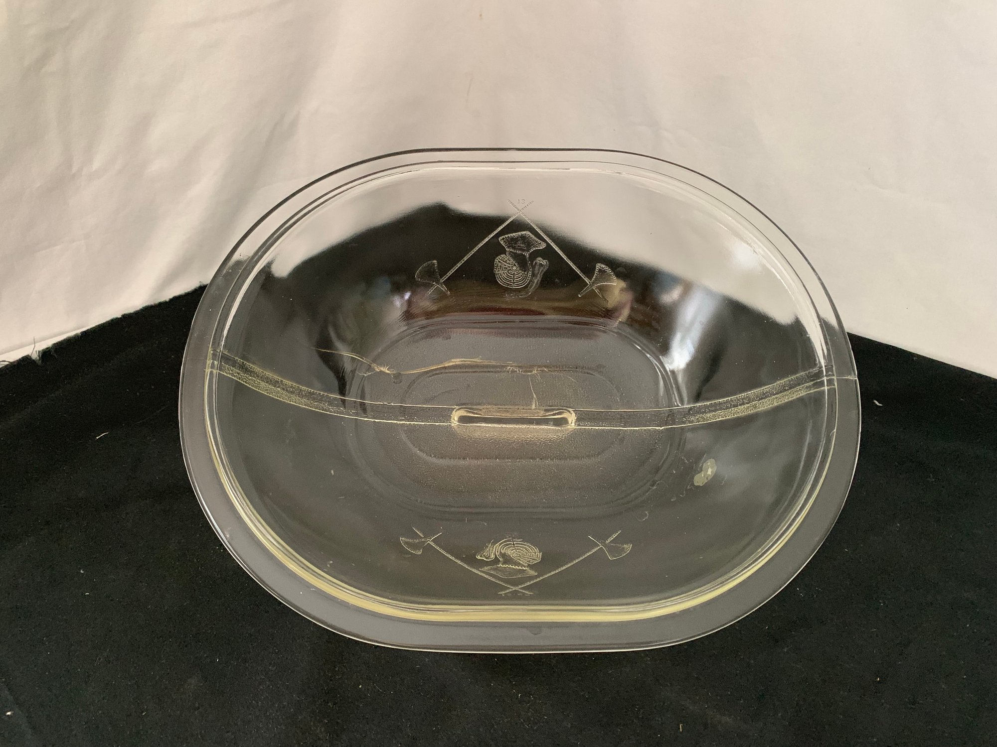 5 Qt. roasting pan ~12" (~15" w/handles), Oval serving tray ~12" (shallow pan) & glass cover (fits both pans)