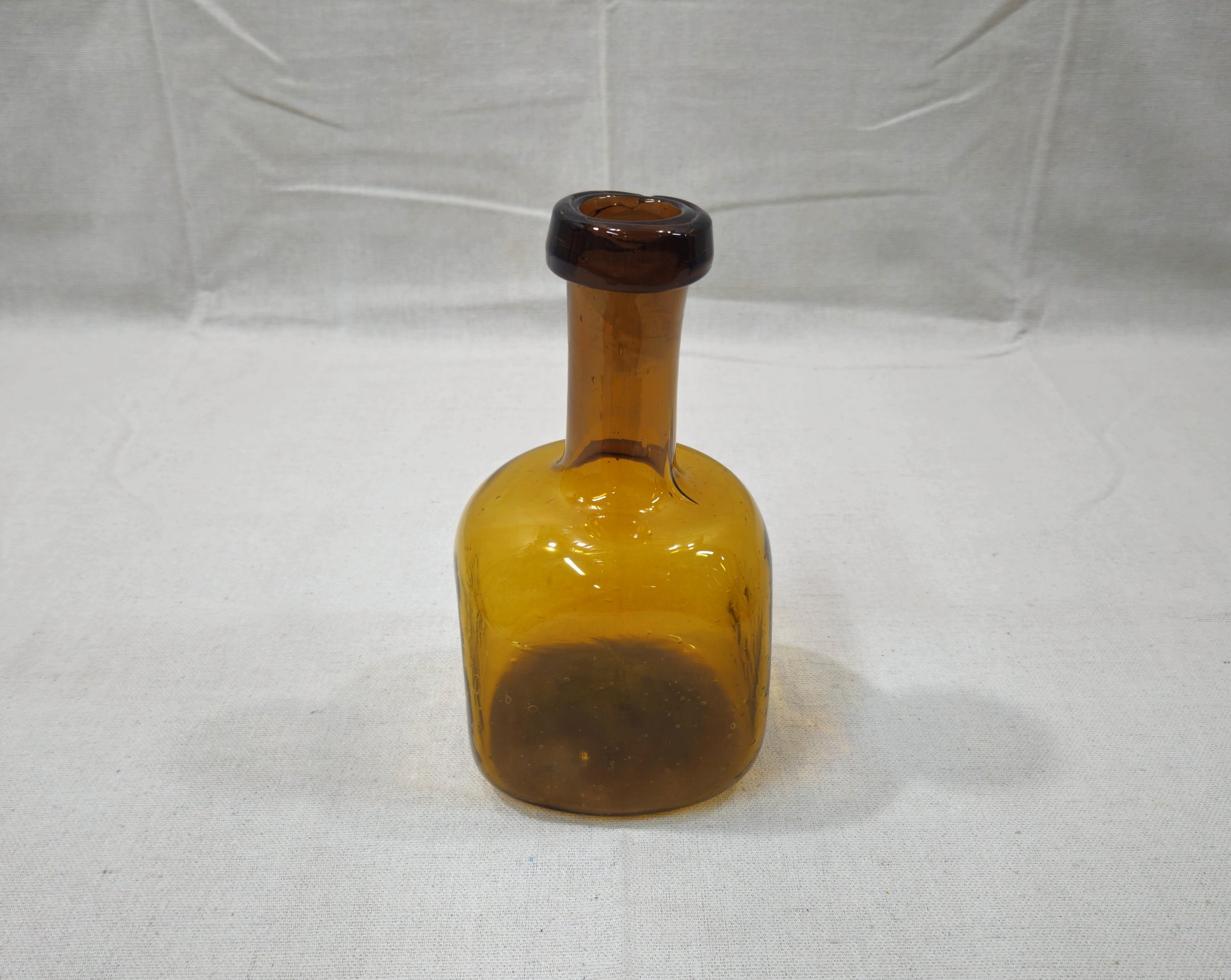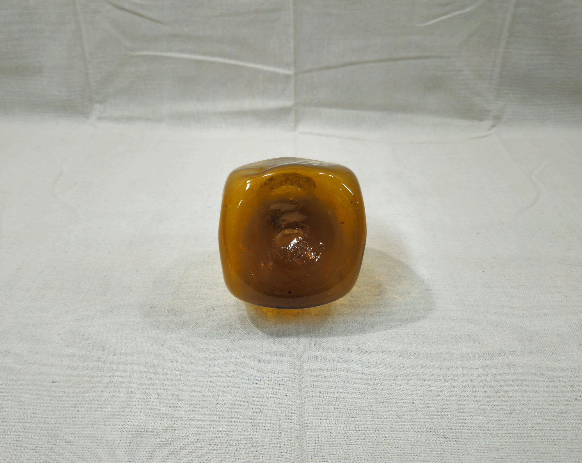 Vintage hand-blown square amber glass bottle with rolled lip and pontil mark on base. Maker unknown.