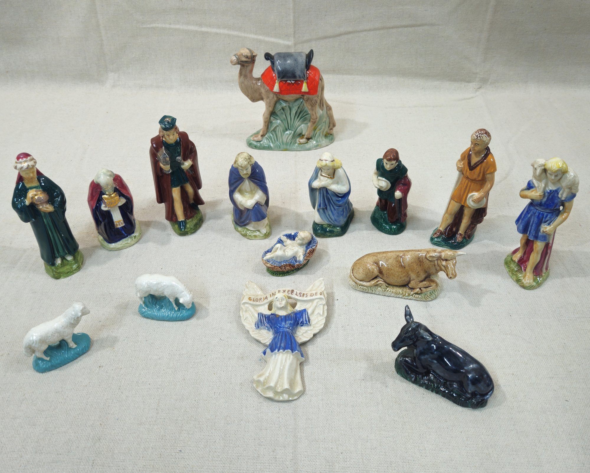 Vintage 15-piece Holland Mold ceramic nativity set including Jesus, Mary, Joseph, wise men, shepherds, angel, and various animals like the camel, sheep, donkey, and a bull. Marked on base