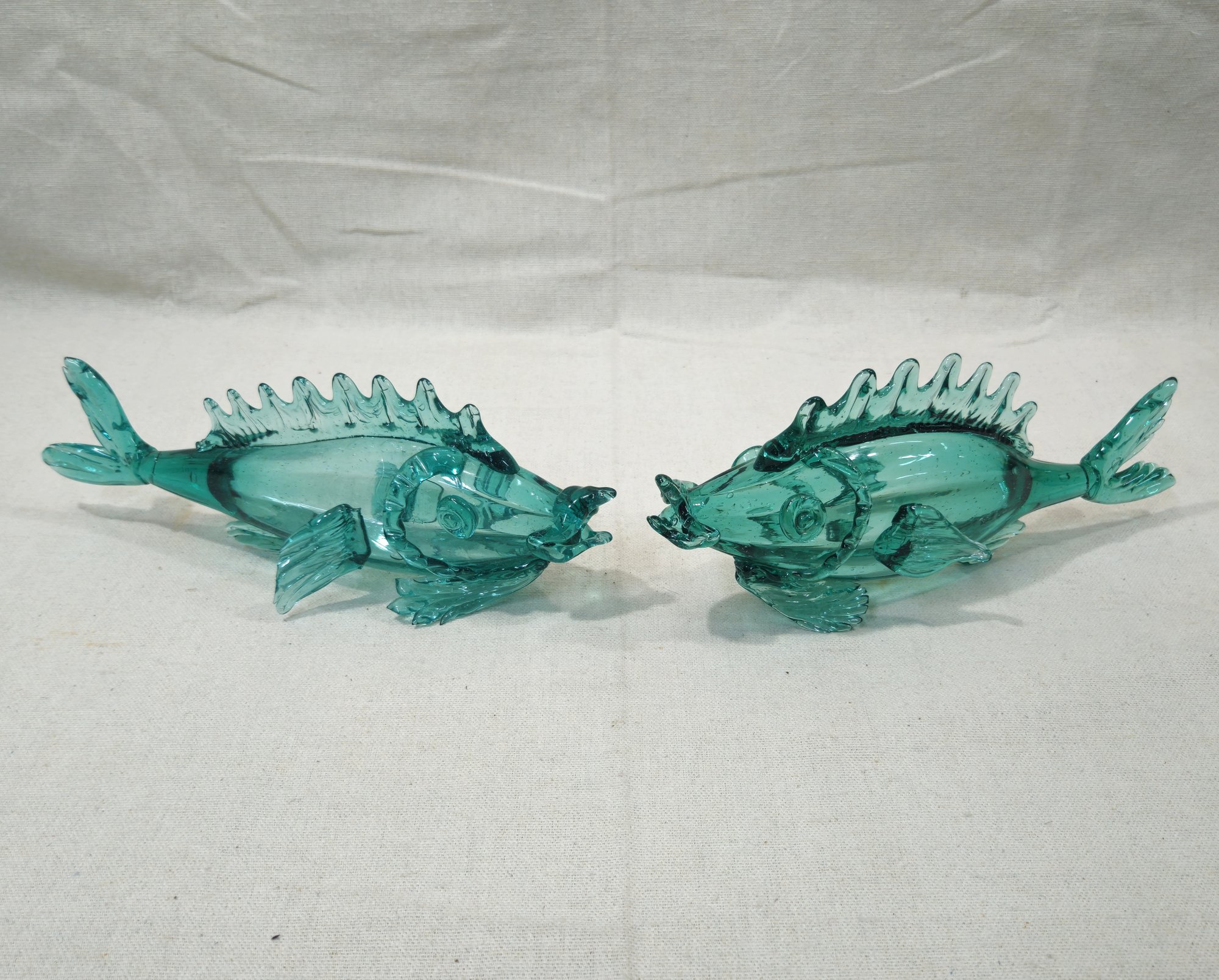 Notes: Vintage Japanese Modernist Handblown Fish Aqua/Teal Glass Sculptures are pre-owned showing signs of wear commensurate with age & use. Please contact for further condition report or photos.