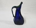 Vintage John Harko handblown glass pitcher in cobalt blue glass embellished with green glass and front embossed Warren, Putnam, Prescott, Stark with Bunker Hill Monument and reverse embossed with a minuteman. Signed on base Harko.