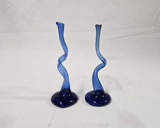 Vintage set of 2 John Harko handblown glass bud vases in cobalt blue glass. Signed on base.