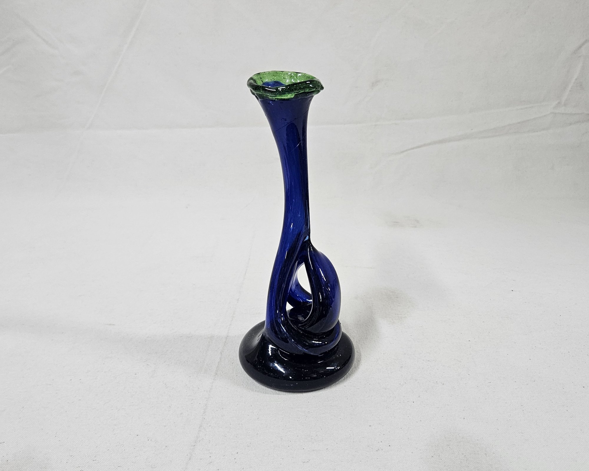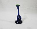 Vintage John Harko handblown glass bud vase in cobalt blue glass embellished with green around lip. Signed on base.
