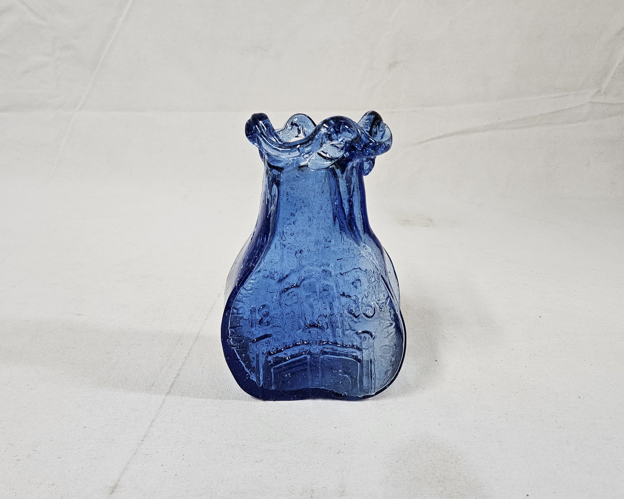 Vintage John Harko handblown glass pitcher in cobalt blue glass with front embossed Hiram Brown/ First Mayor/ 1846 with Manchester city hall and reverse embossed M.W.W. (Manchester Water Works)/ 1871/ Massabessic Lake with a hydrant & man with hose. Signed on base Harko.