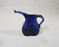Vintage John Harko handblown glass pitcher in cobalt blue glass, front embossed Hiram Brown/First Mayor/1846 with Manchester city hall, and reverse embossed City of Manchester Incorporated June 1846 with Manchester, NH city seal. Signed on base Harko.