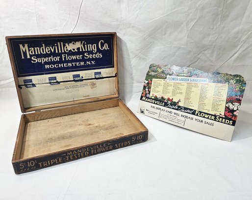 Vintage Mandeville & King Co. Triple-Tested Flower Seeds advertising store wood display box with additional later display card topper.