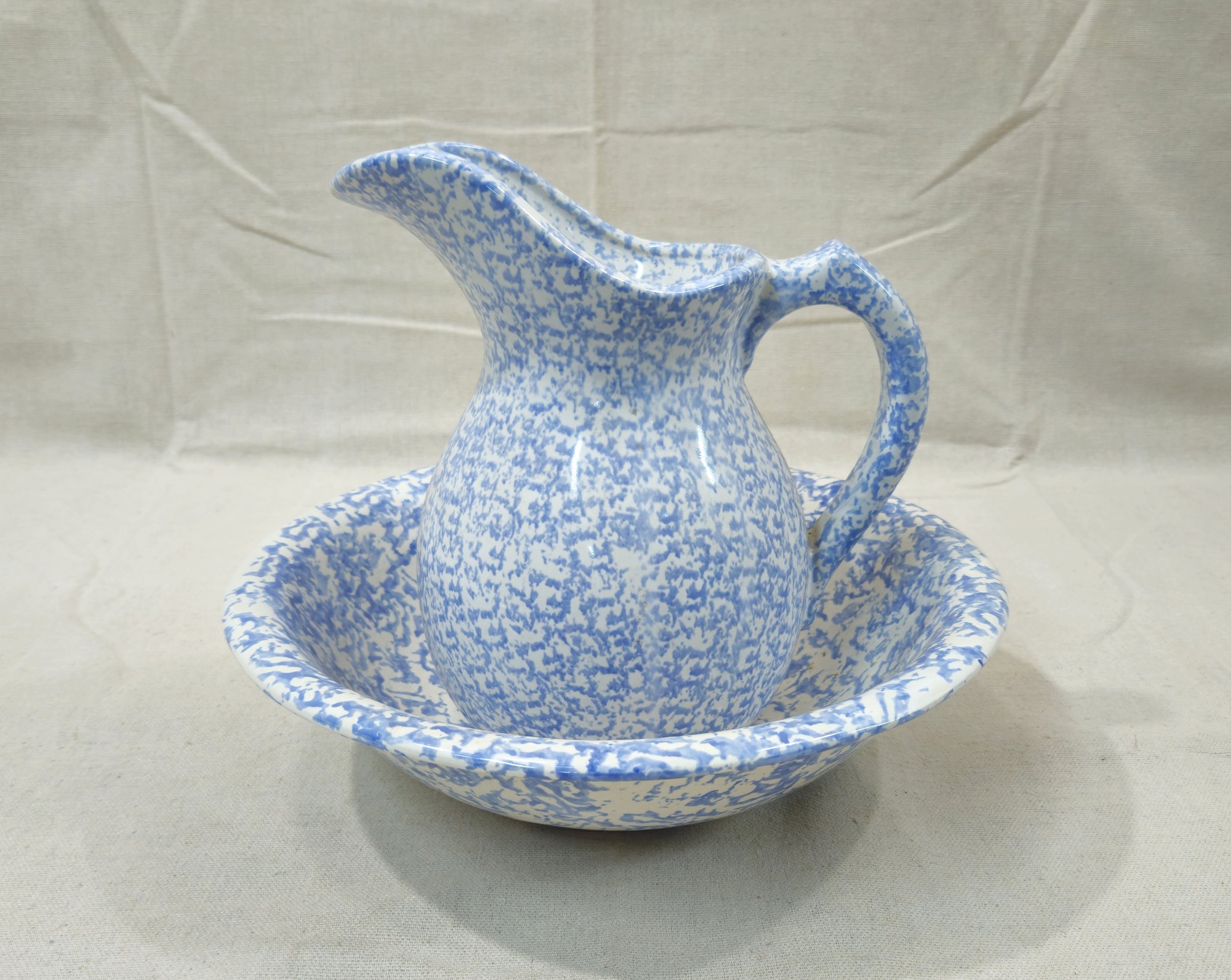 Vintage art pottery blue & white spongeware pitcher & bowl basin set. Produced and marked on underside of each piece by McCoy.