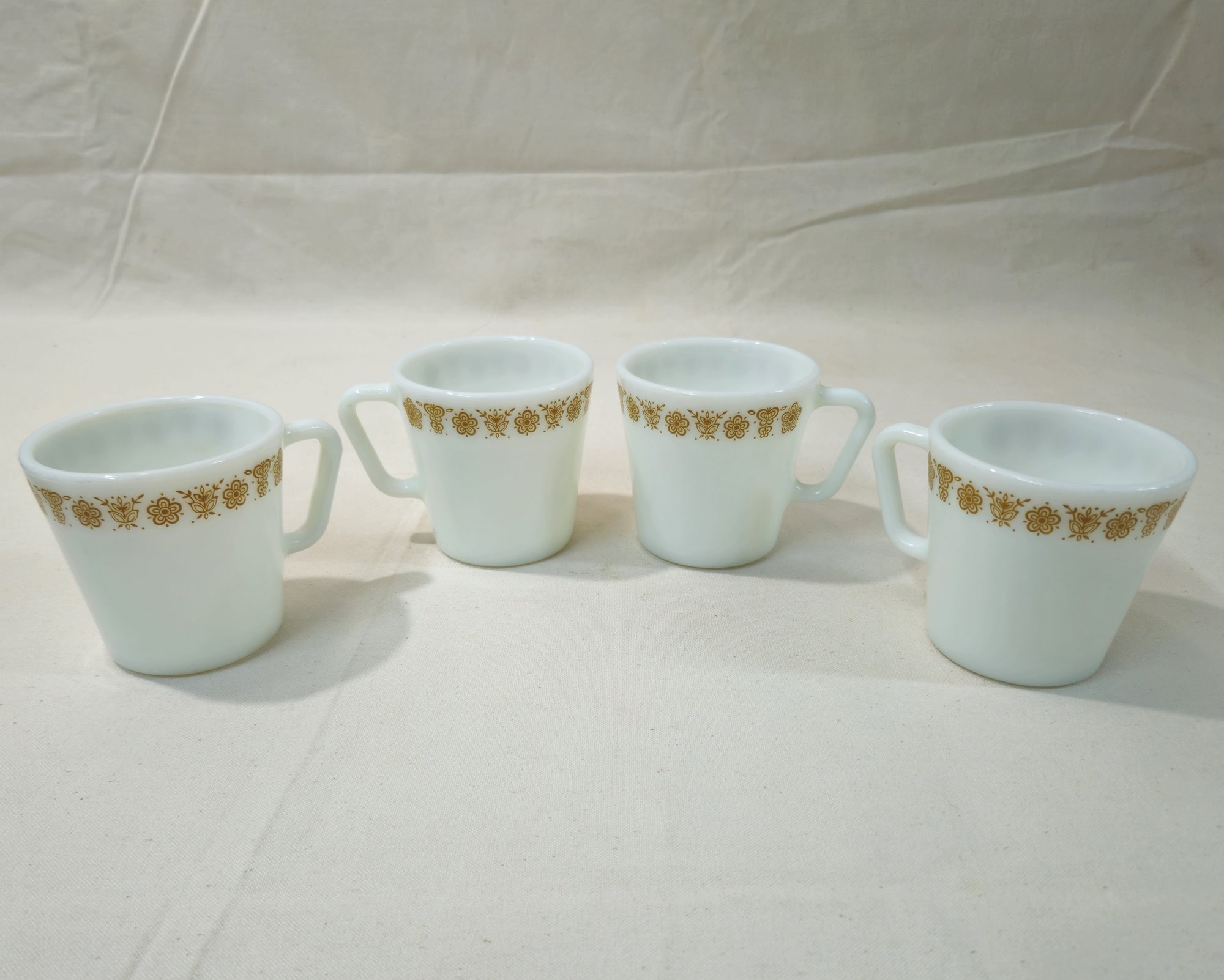 Notes: Vintage Pyrex Butterfly Gold 1 Coffee Cups Set of 4 are pre-owned showing signs of wear commensurate with age & use. Please review photos.
