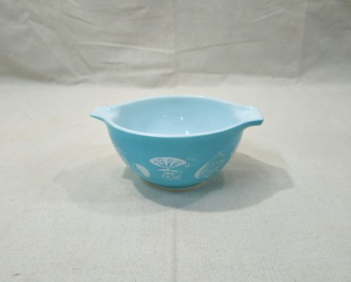 Vintage Pyrex Promo Balloons Cinderella Dip Bowl #441 in turquoise with white pattern.