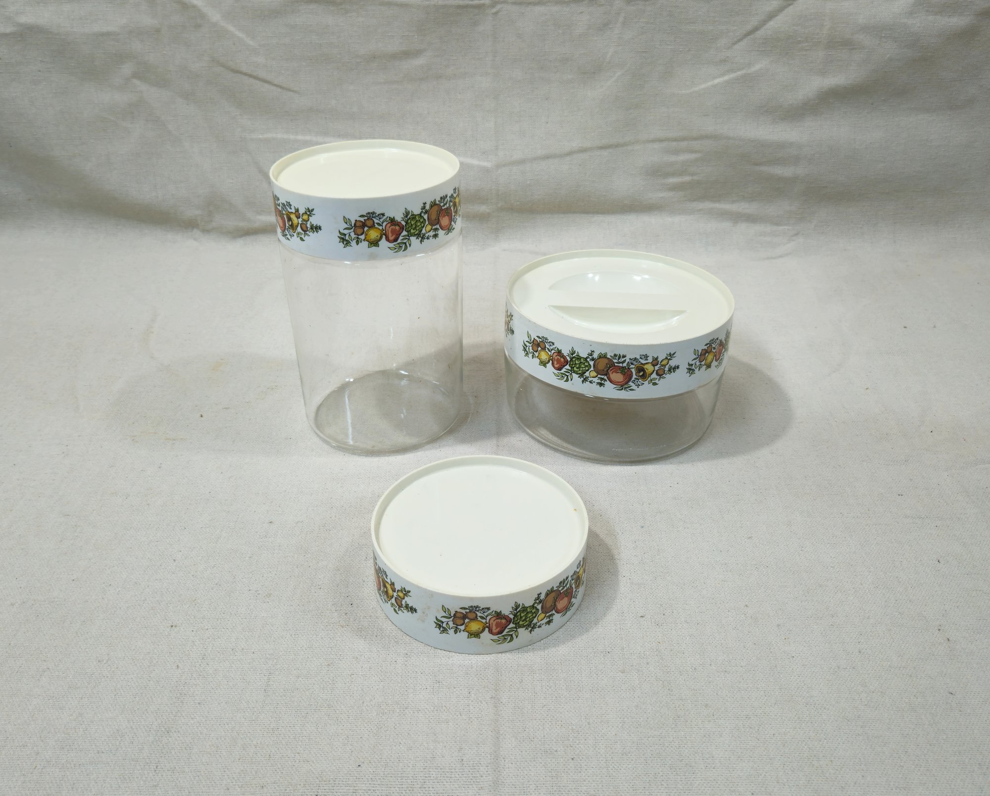 Group of ~2 Vintage Pyrex See 'N Store Spice of Life canister jars with lids and an additional lid.