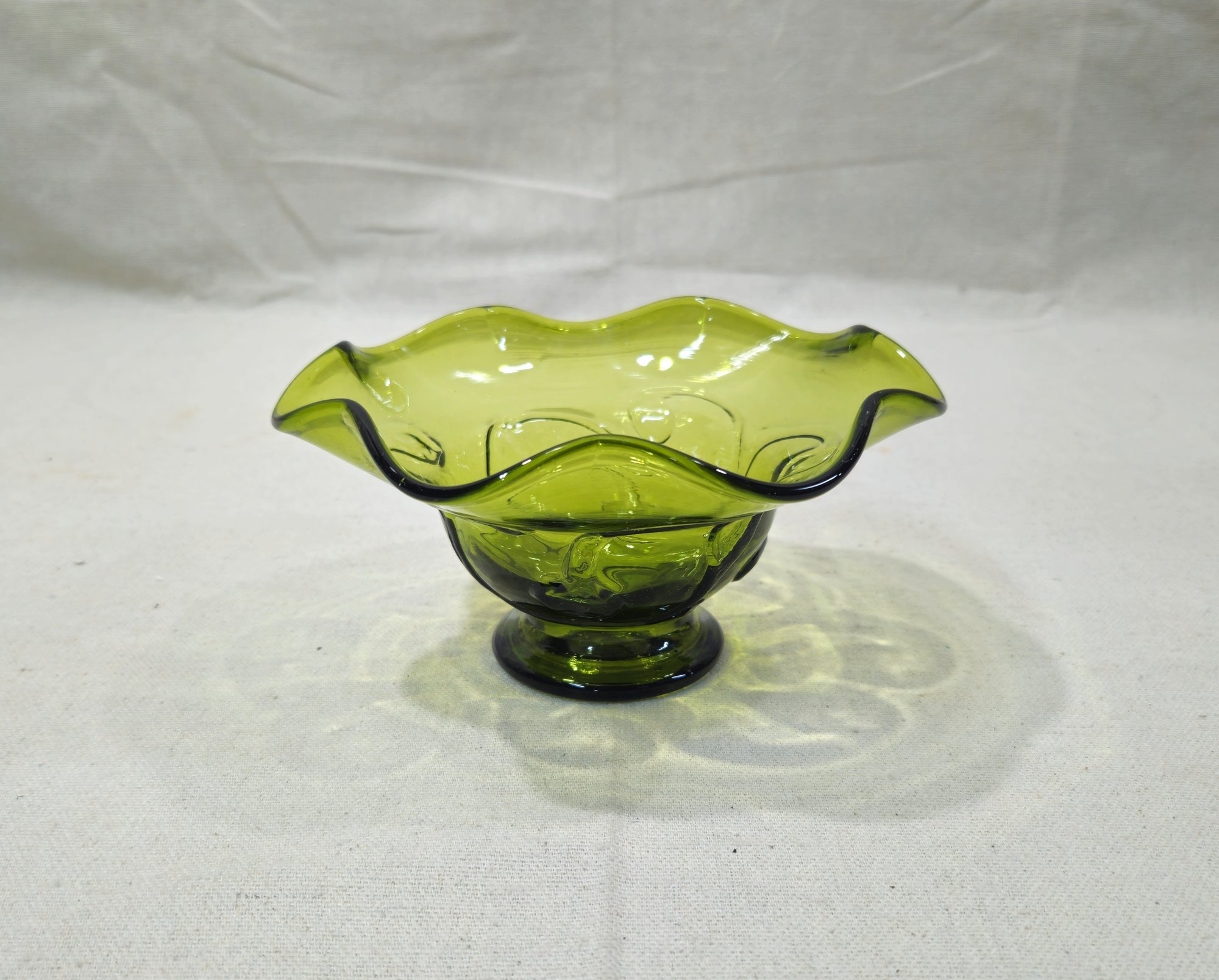 Notes: Vintage Rainbow Art Glass Handblown Replica Lily Pad Green Glass Ruffled Dish are pre-owned showing signs of wear commensurate with age & use. Please contact for further condition report or photos.