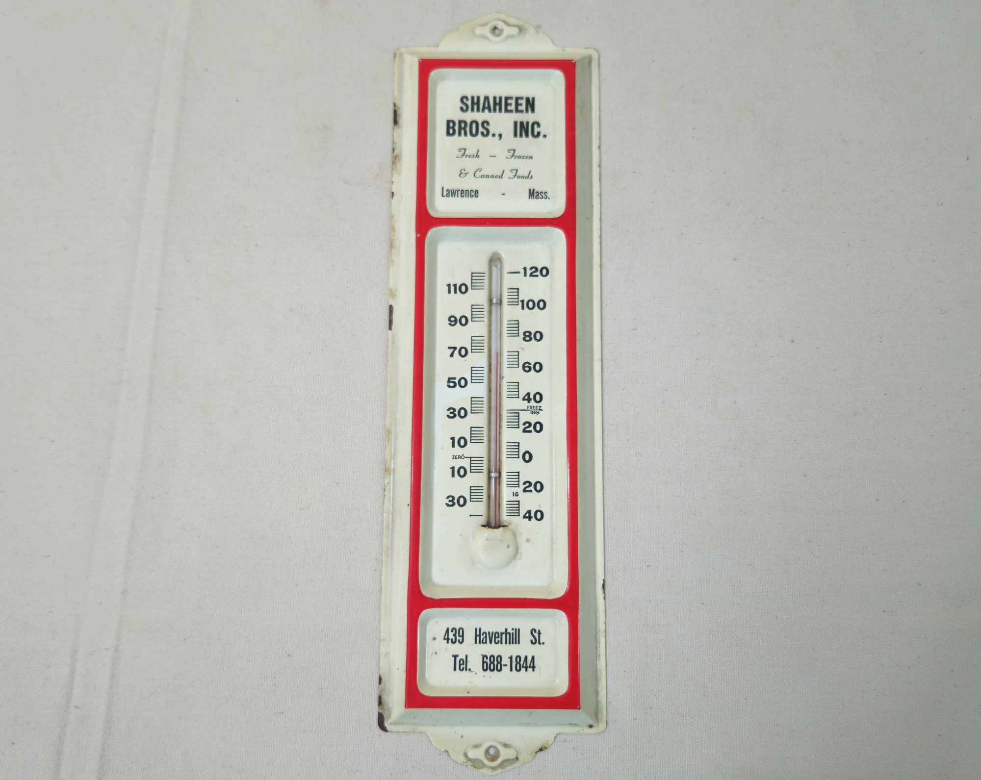 Vintage Shaheen Bros., Inc., Lawrence, Mass. pressed tin advertising thermometer.