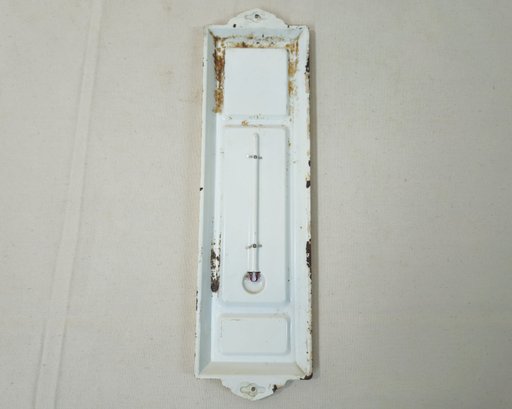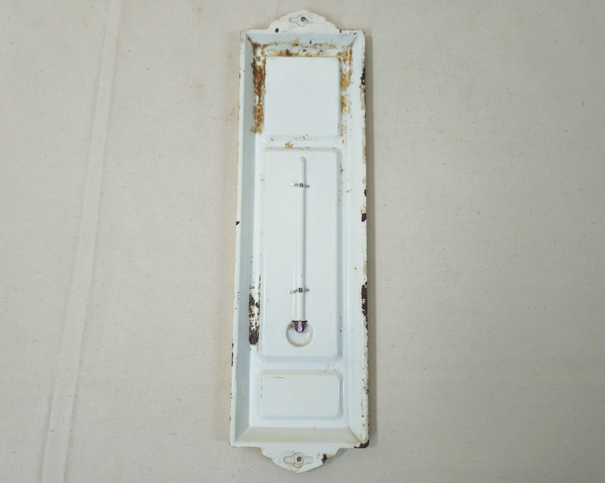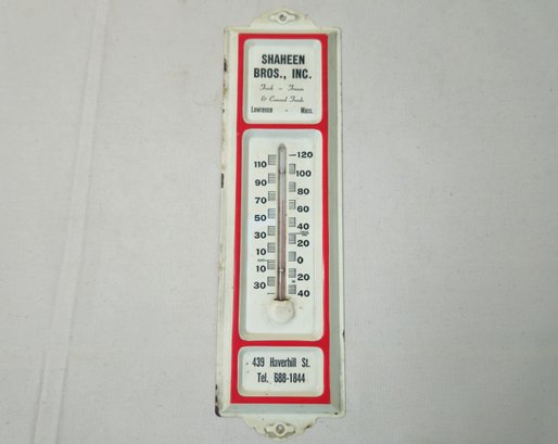 Notes: Vintage Shaheen Bros., Inc., Lawrence, Mass. Pressed tin Advertising Thermometer is pre-owned showing signs of wear commensurate with age & use. Please review photos.