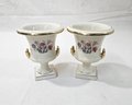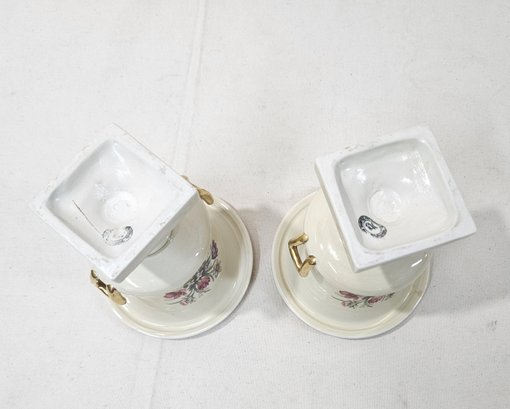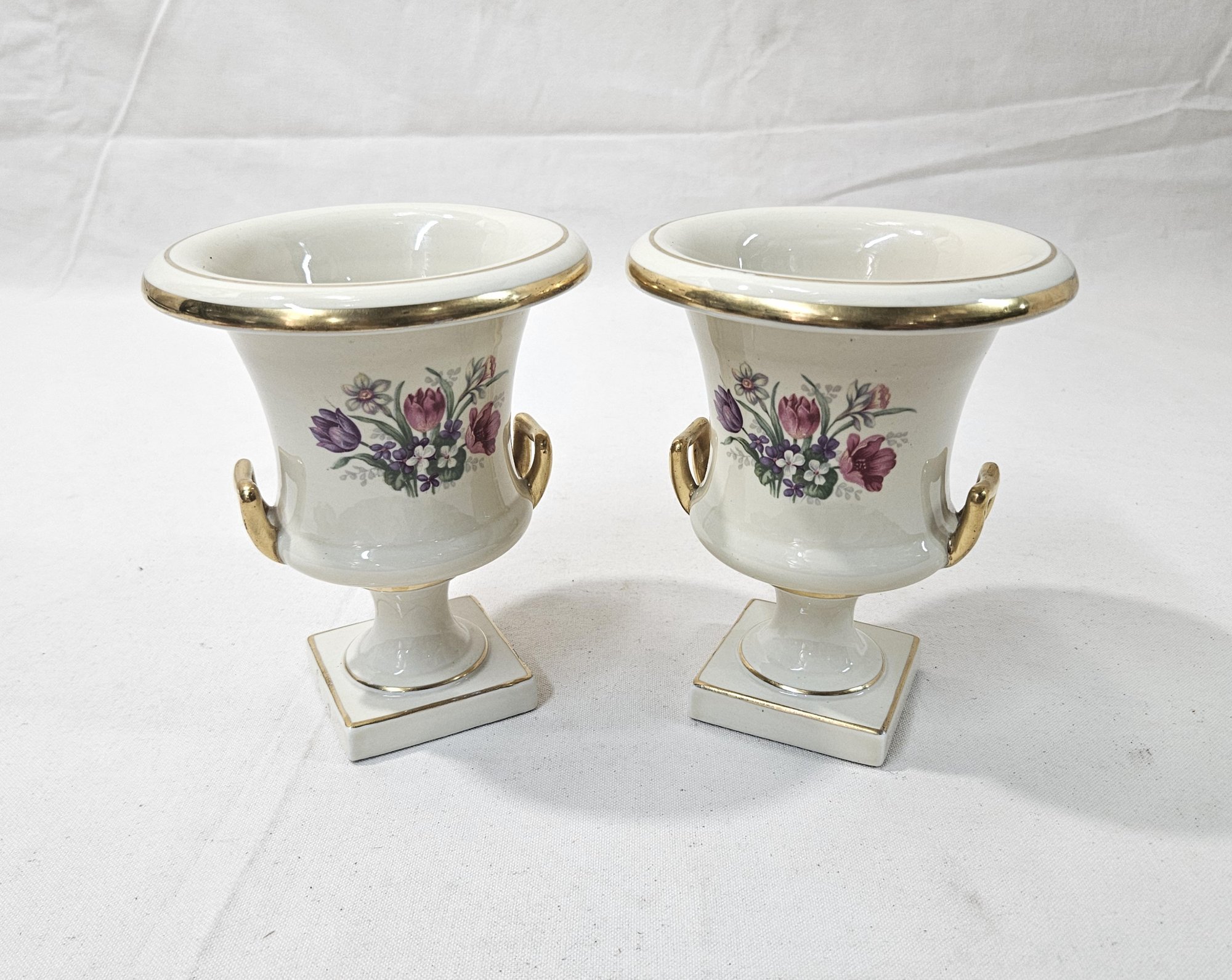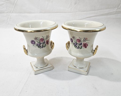 Set of vintage porcelain urn vases decorated with flower scene and gilt edges. Produced by The Trenton Potteries and marked on base with green stamp.