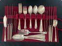 6 dinner forks, 6 salad forks, 6 dinner knives, 12 spoons, 6 soup spoons, 4 butter knives, master butter, sugar spoon, 4 tablespoons & serving fork