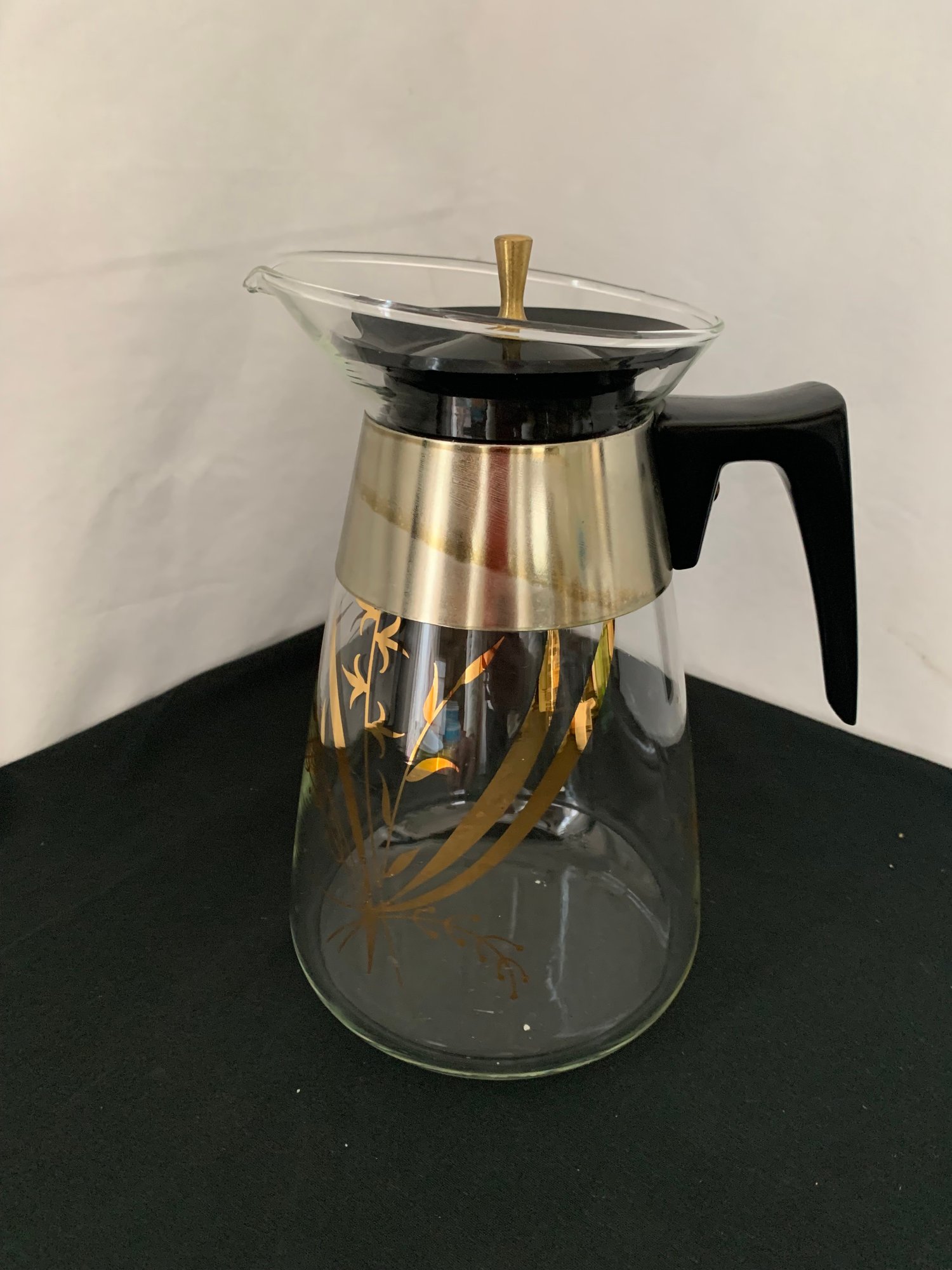 Notes: Pyrex glass coffee carafe gold floral design is pre-owned showing light signs of wear commensurate with age & use. Please review picture