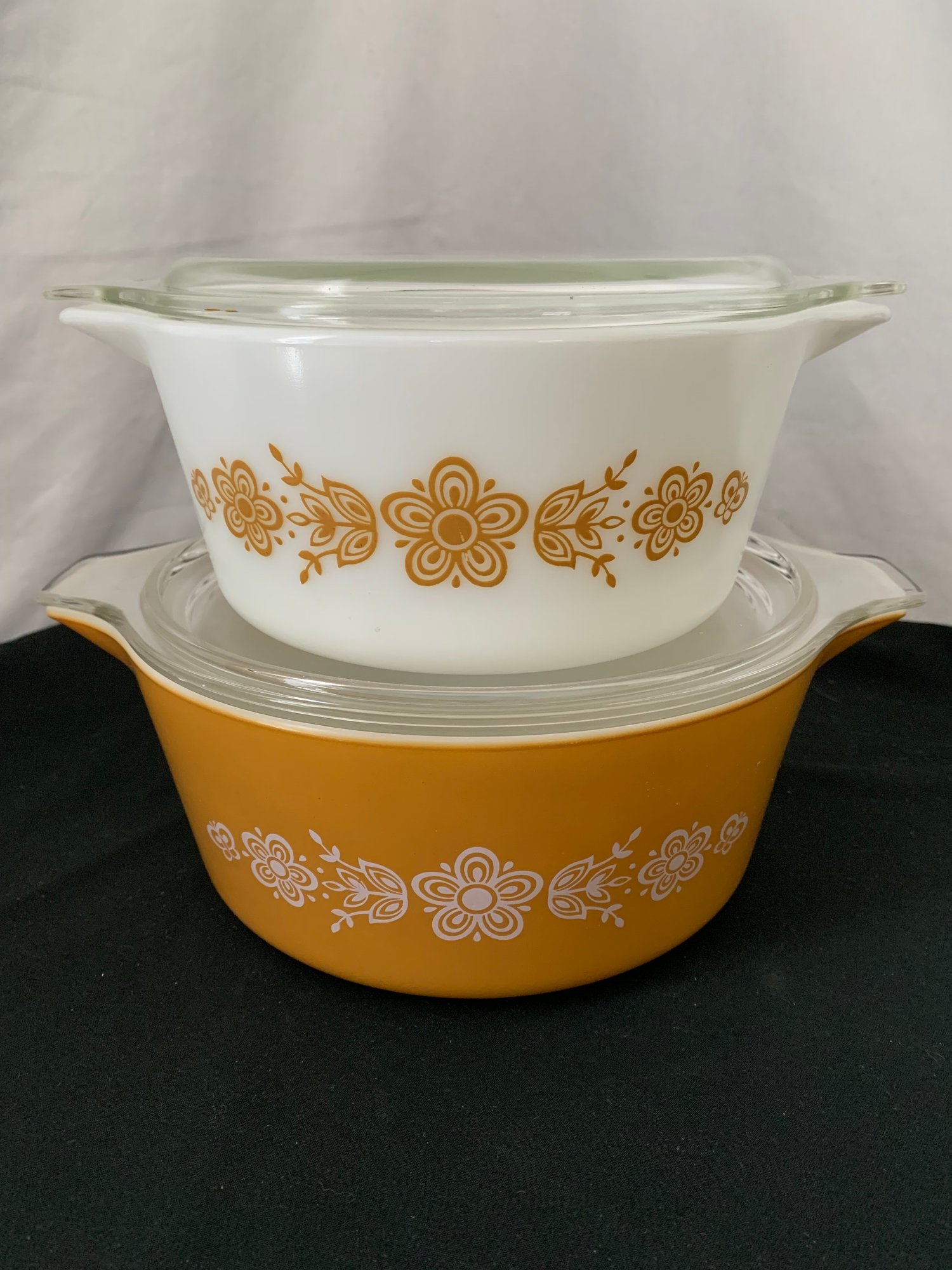 Notes: Pyrex Butterfly Gold casseroles are pre-owned showing light wear commensurate with age & use with no apparent flaws. Please review pictures.