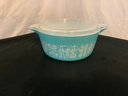 Pyrex Butterprint 475 - 2 1/2qt. round casserole with white pattern on turquoise & lid 475.