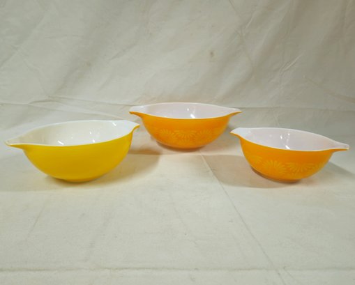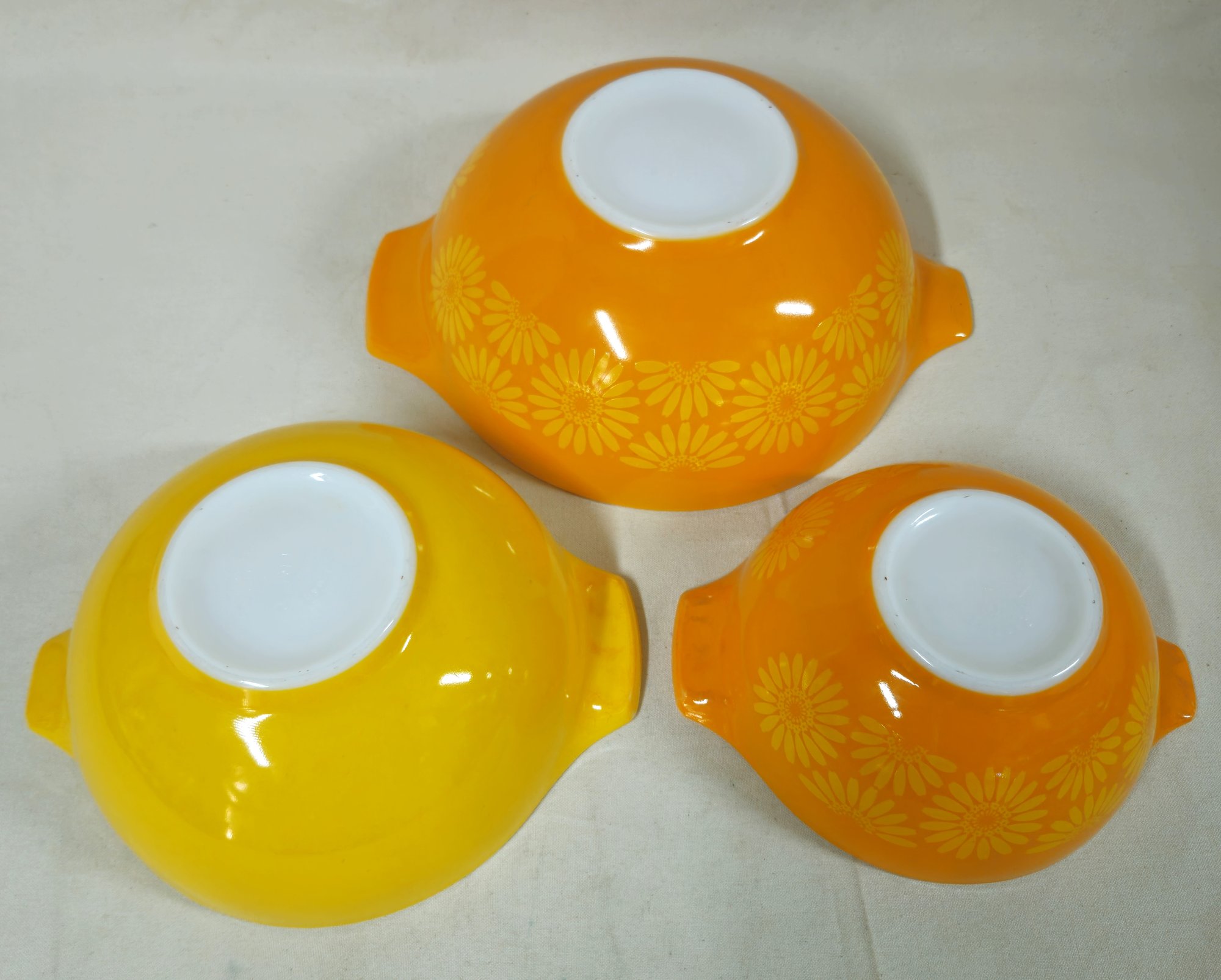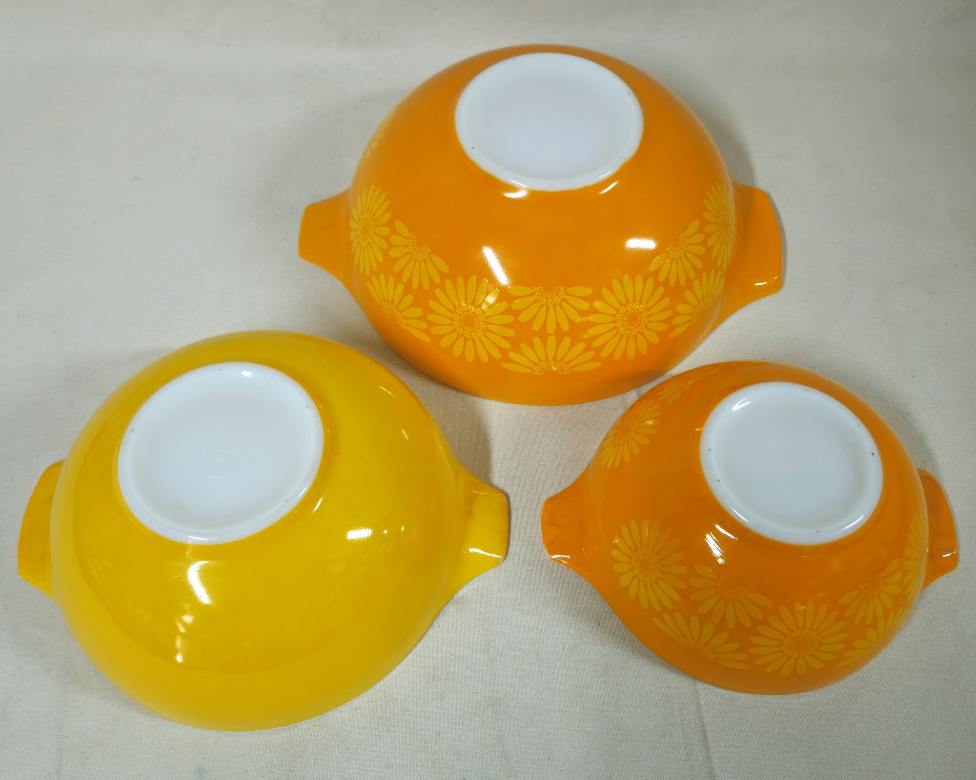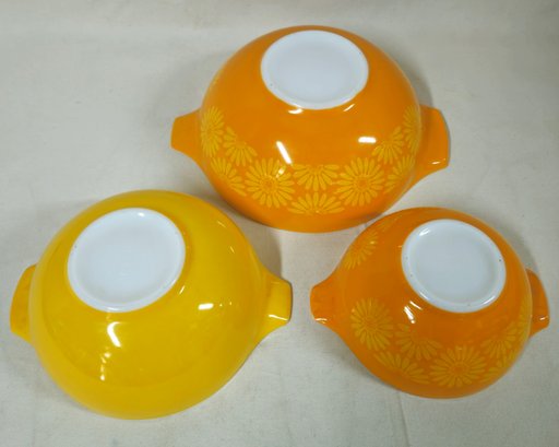 Notes: Pyrex Daisy Cinderella Mixing Bowls are pre-owned showing light signs of wear commensurate with age & use, individual bowls may have various blemishes, and all bowls with no major apparent identifiable flaws. Please review pictures.