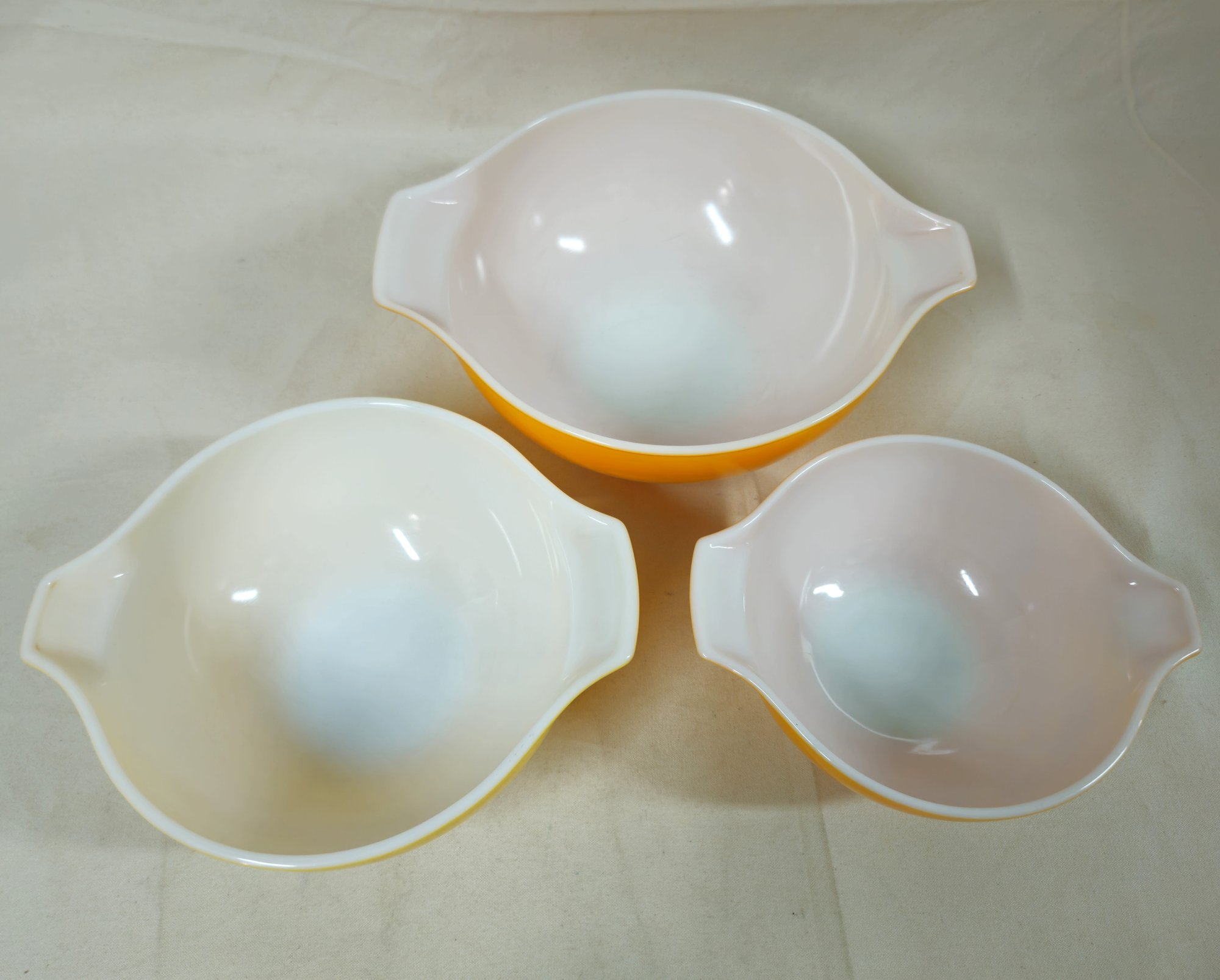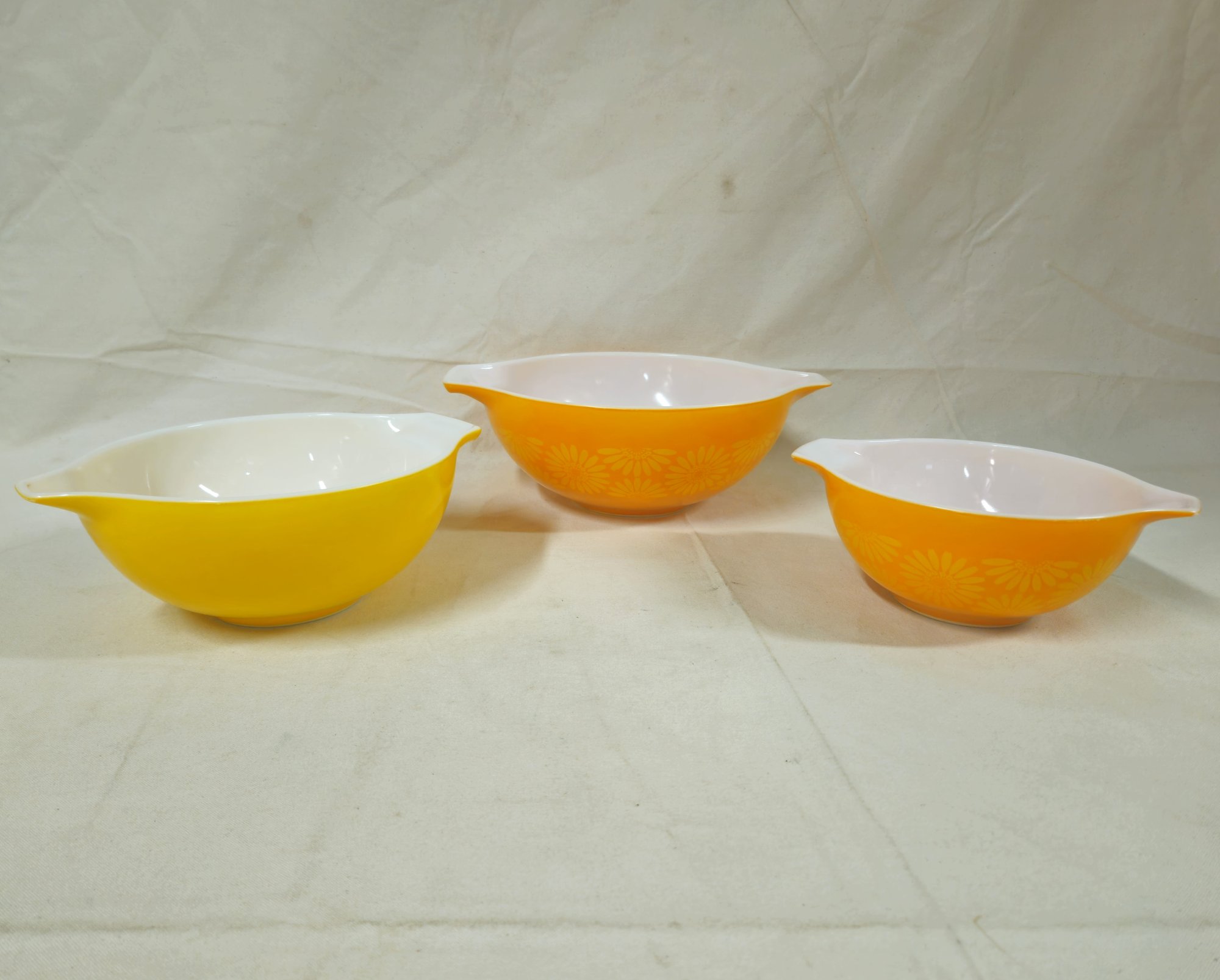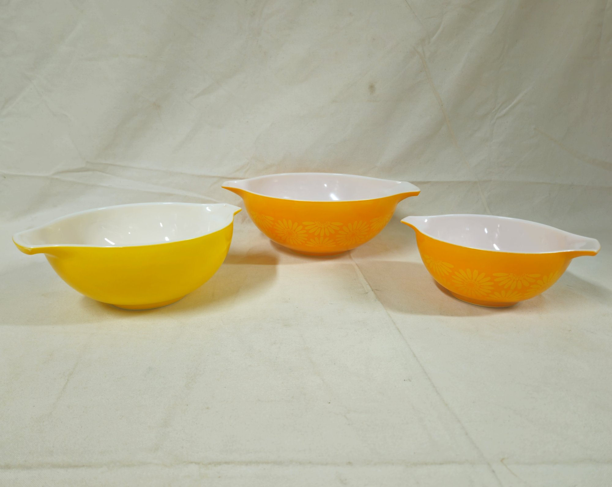 Notes: Pyrex Daisy Cinderella Mixing Bowls are pre-owned showing light signs of wear commensurate with age & use, individual bowls may have various blemishes, and all bowls with no major apparent identifiable flaws. Please review pictures.