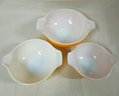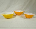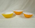 Group of ~ 3 Pyrex Daisy Cinderella mixing bowls including a 442- 1 1/2qt. bowl, a 443- 2 1/2qt. bowl, and a 444- 4qt. bowl. Produced by Corning Glass Works.