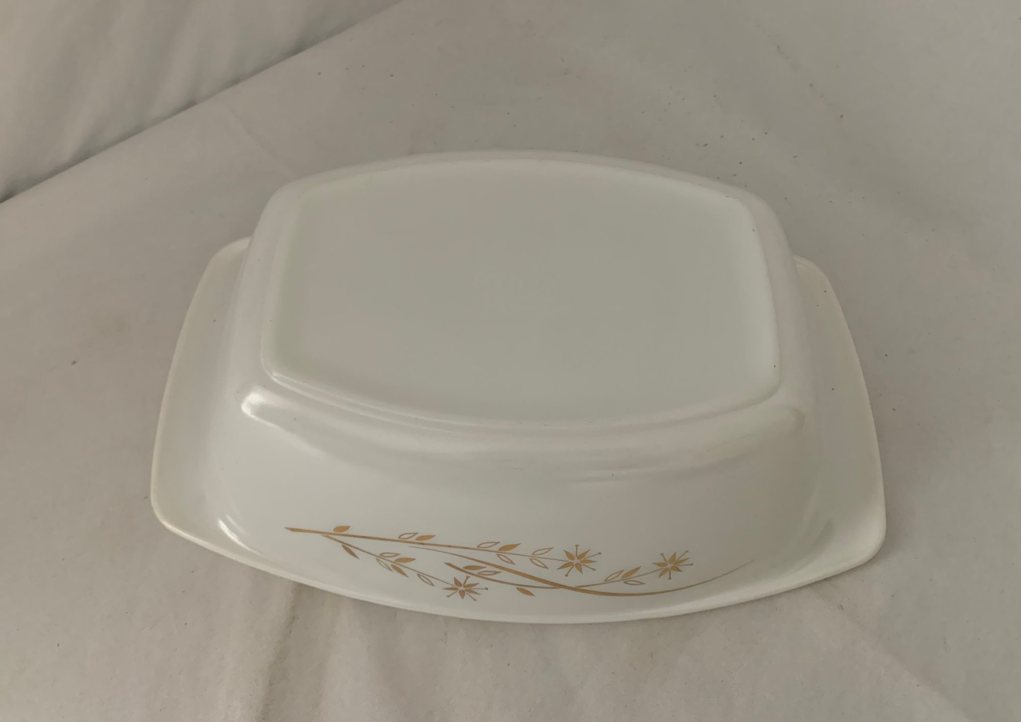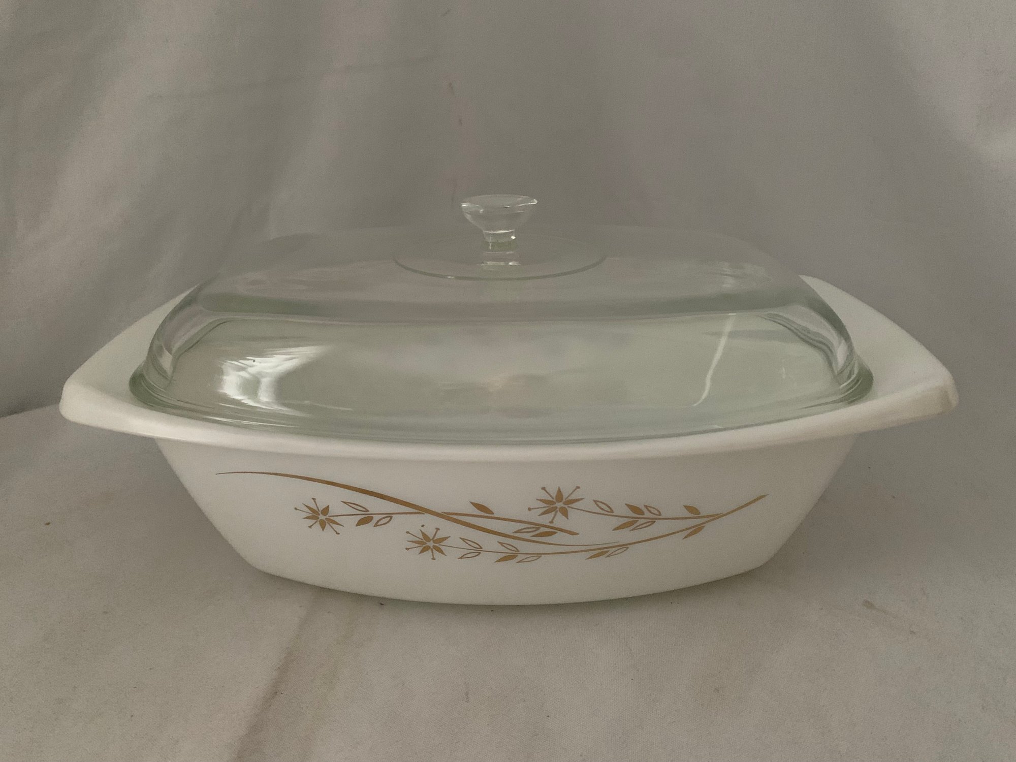 Notes: Pyrex Golden Honeysuckle 4qt. Casserole With Lid is pre-owned showing light signs of wear commensurate with age & use and has no major apparent identifiable blemishes or flaws. Please review pictures.