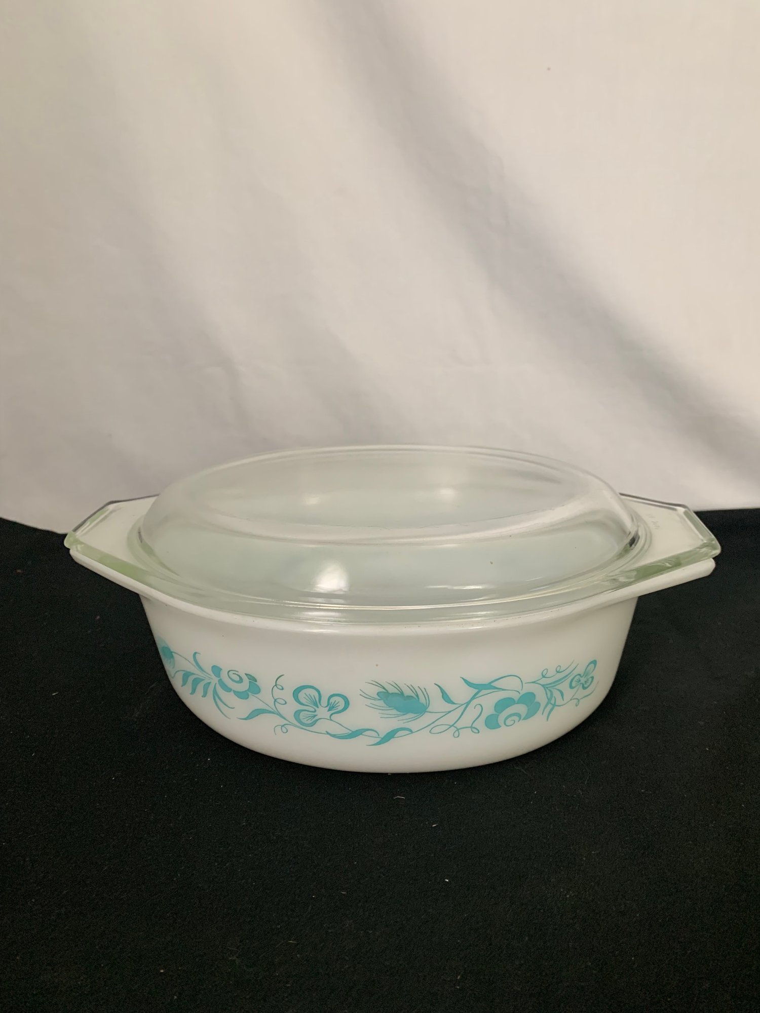 043 - 1 1/2 qt oval casserole (turquoise Meadow decoration on white) w/lid