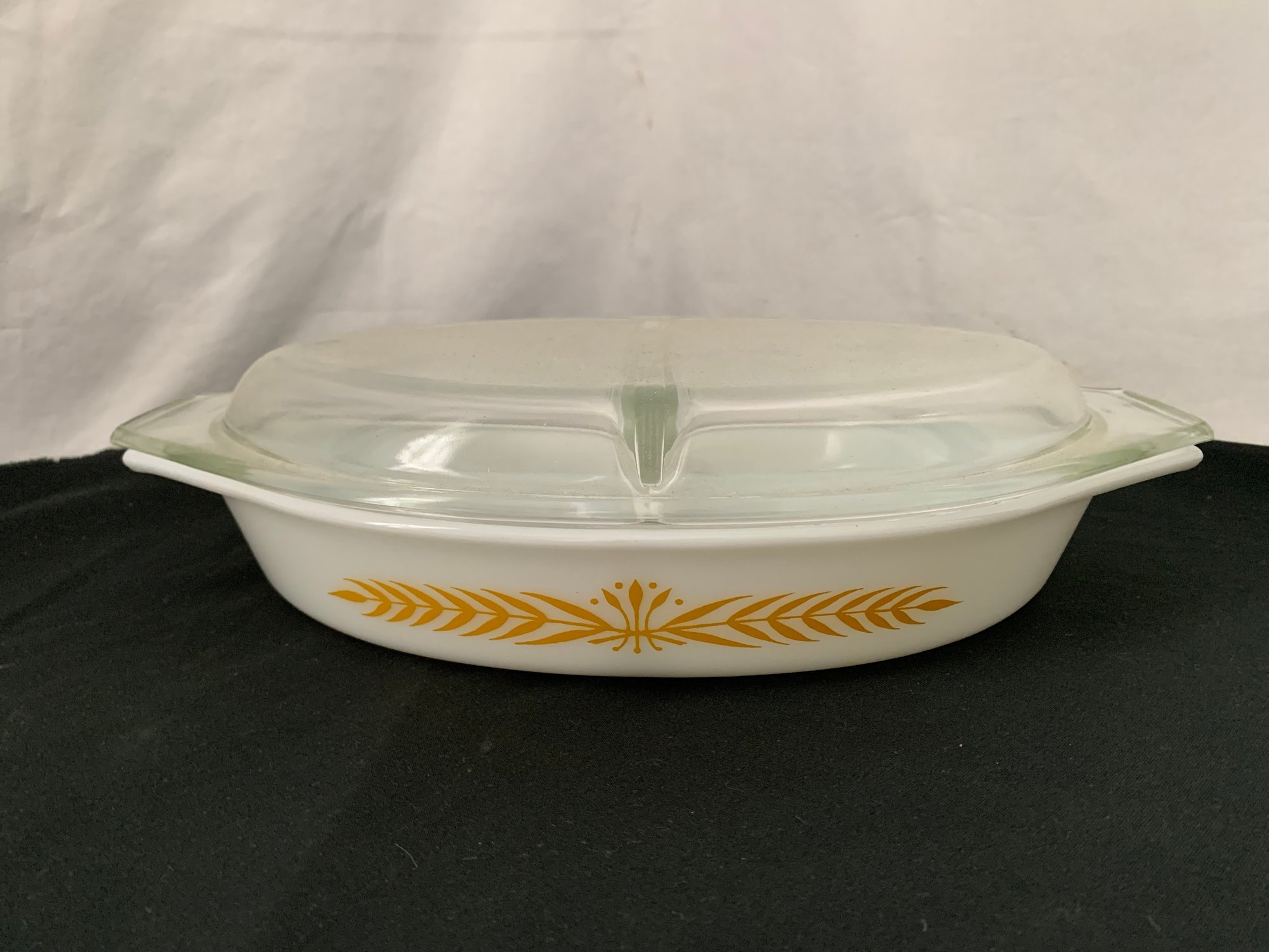 Notes: Pyrex promotional Royal Wheat divided dish is pre-owned showing light wear commensurate with age & use with no apparent flaws. Please review pictures.